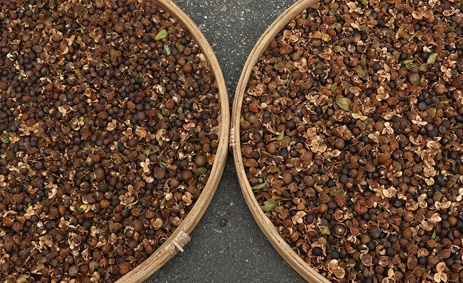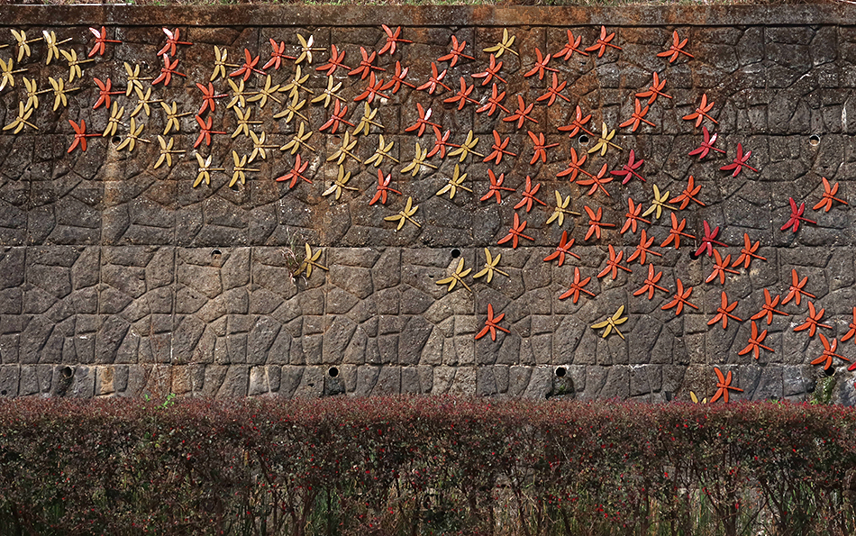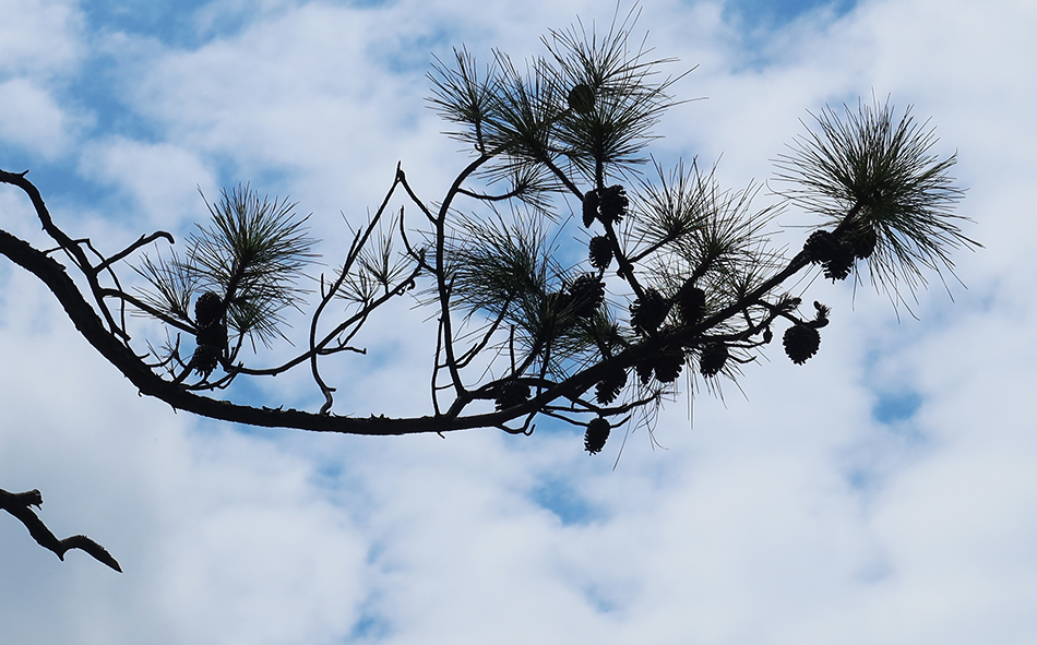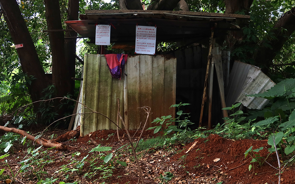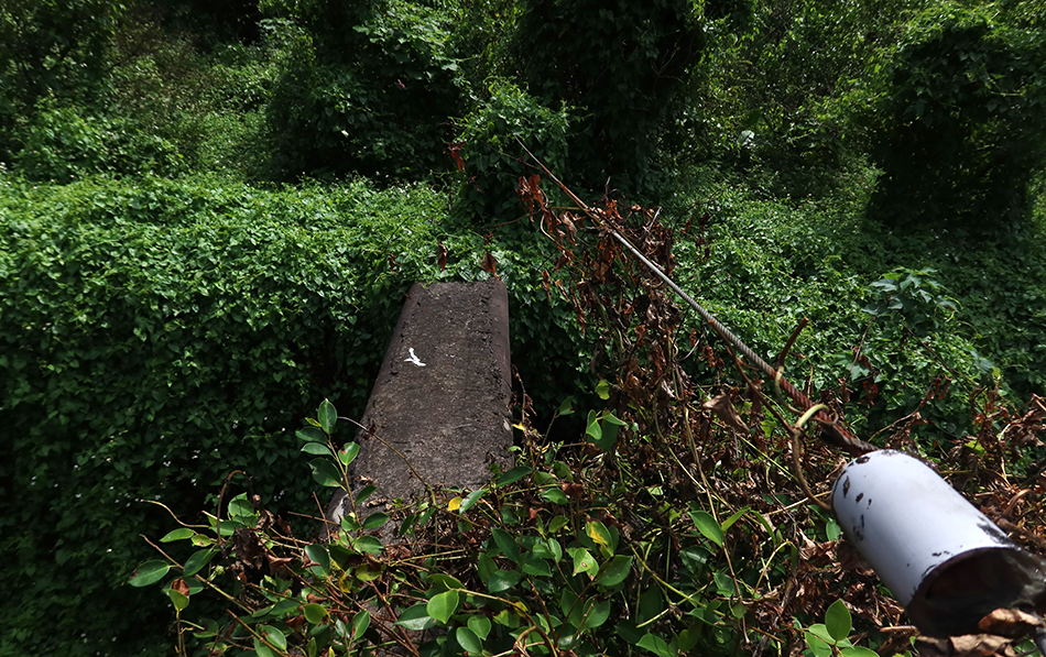 It appears in the distance, sticking up on the horizon, and my luck is in, so I chill out for a few minutes in its shade. No traffic comes by in that time. Terraced fields of tea surround me.