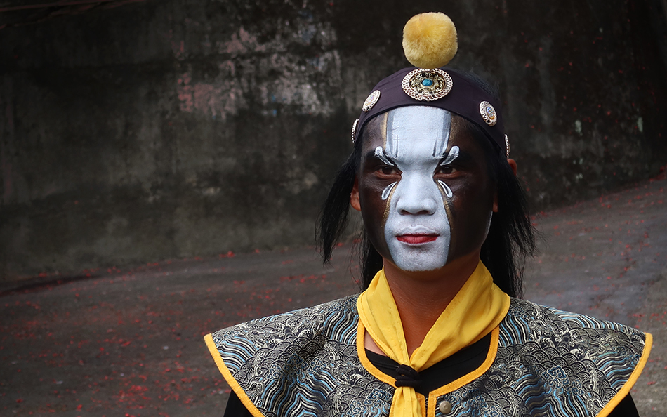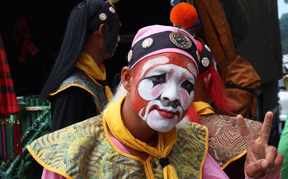 A temple is tucked away off the road and group of young men dressed up as dieties or whatever are heading down its steep concrete approach road towards a small truck. With their elaborate face paint, it's hard to gauge their actual expressions, but taking a few snaps seems OK.