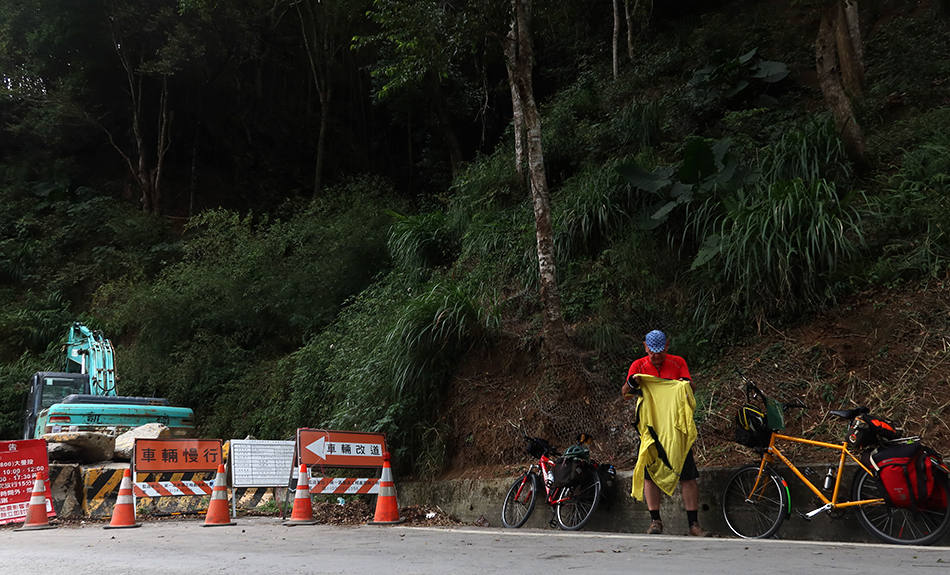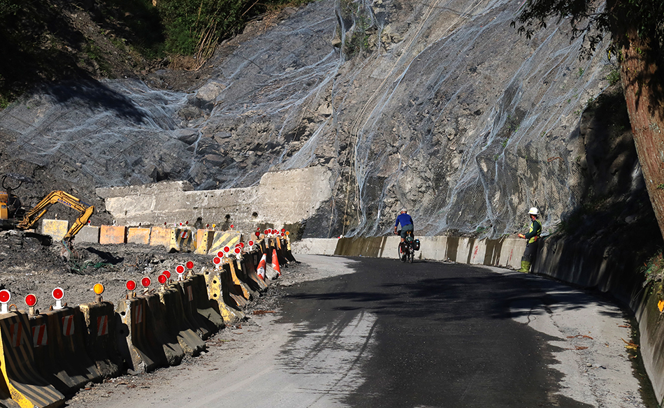 We sit on some metal stools and chat and wait until the supervisor waves us through before anyone else. We see why soon enough. The route is a wet mess of stone debris from a huge landslide. Workers are securing the mountainside and a long line of vehicles is lined up at the other end, also waiting to get going. No doubt some have been there almost two hours.
