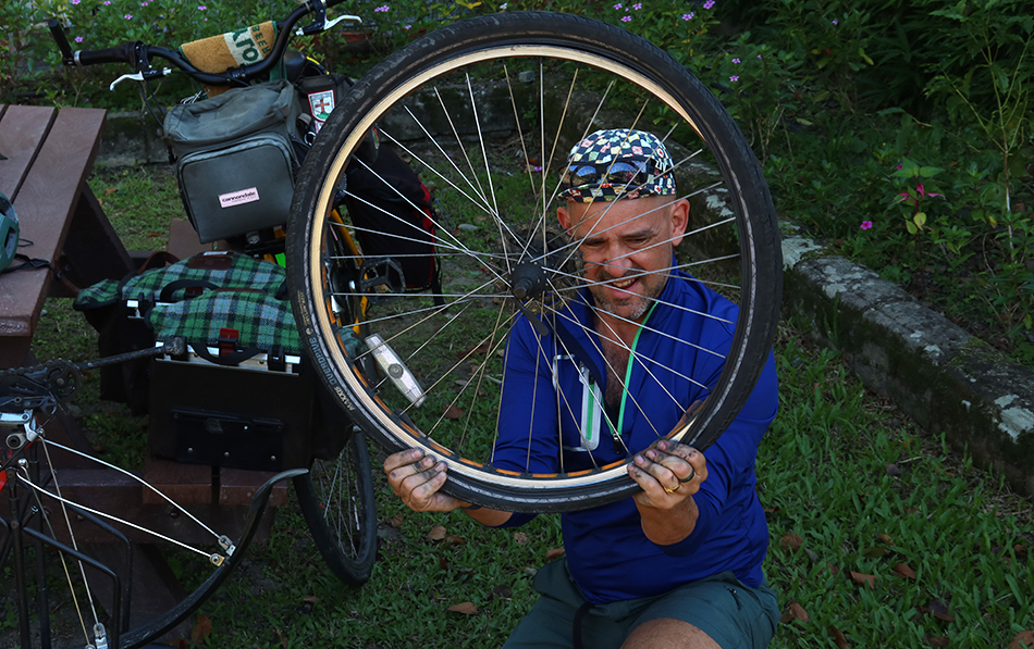 It doesn't take g long to patch his tube, then we spray on some sun cream before riding the few kilometers along the riverside section of Highway 7 before making a left to start riding up the Cross-Island part.