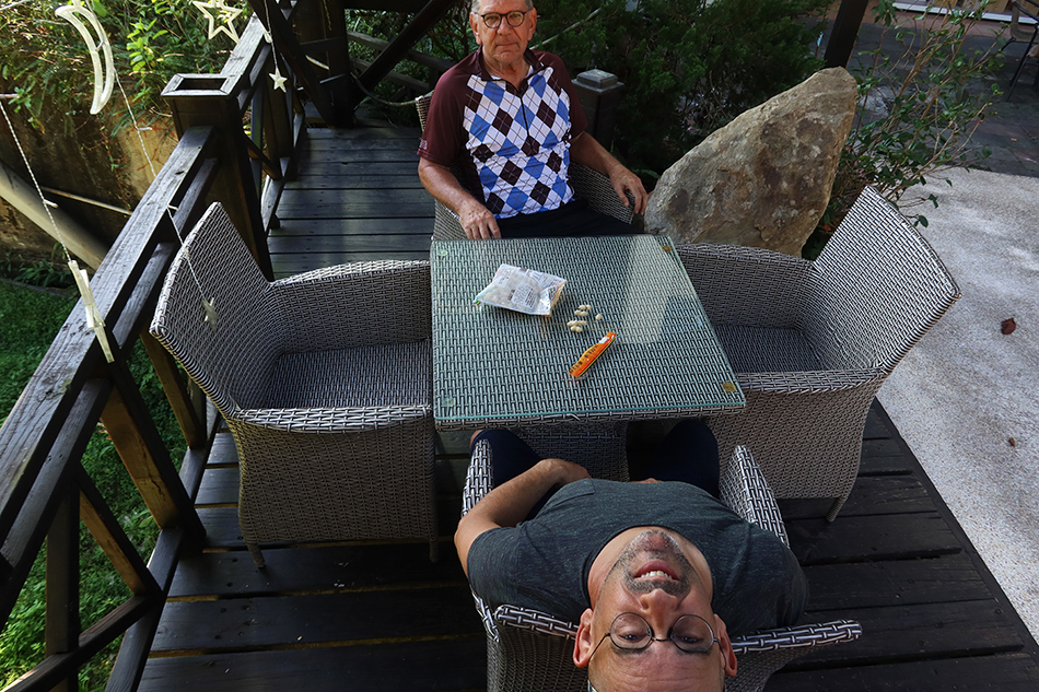 There's one seller that serving coffee that's way overpriced. It's locked up, but a man appears and agrees to serve us. We pay NT$150 (about US$5) each for cappucchinos, and sit on wicker chairs at a table overlooking the valley. He brings us black coffee.