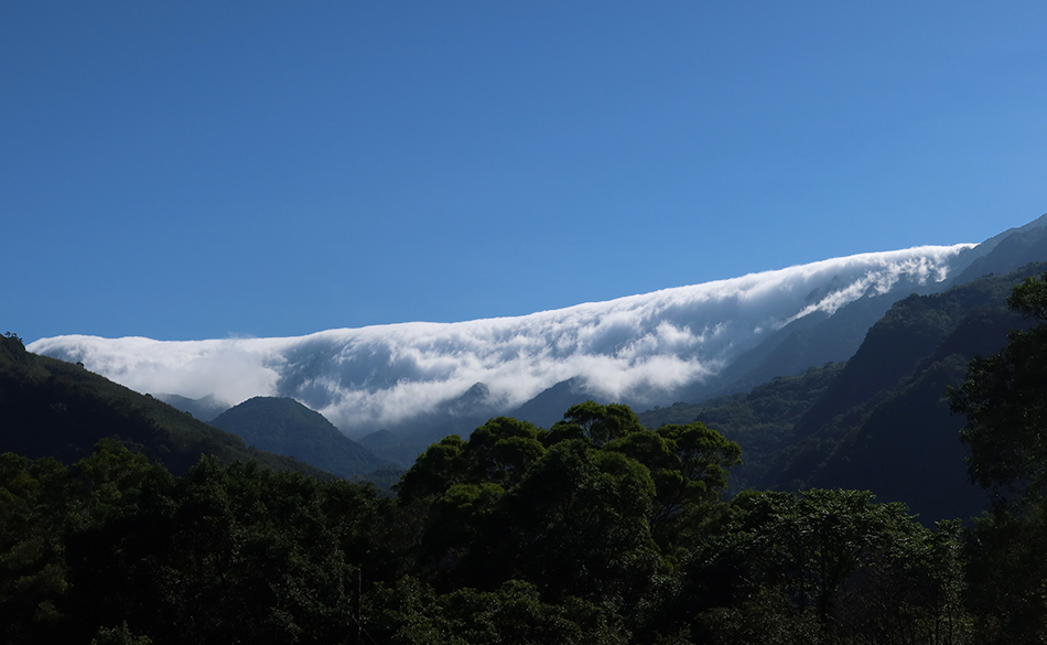 Across the road, slightly obscured by a metal-clad warehouse, are white clouds cascading over a high ridge of the Central Mountains. I walk over and take a snap before we get to the final climb on the 7. It's horrible.