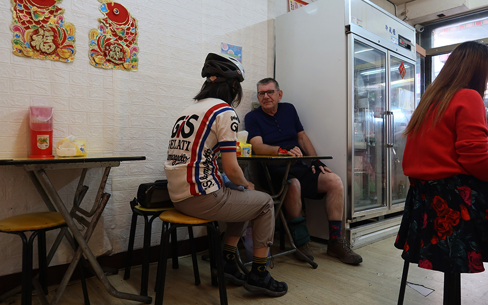 We leave the bikes locked up outside the shop and go for a walk around. Debbie buys a single carrot for the equivelent of 30 cents, then we dine in a backstreet Vietnamese place. I have a bagette sandwich while Debbie has a bowl of noodles, which she's not impressed with.