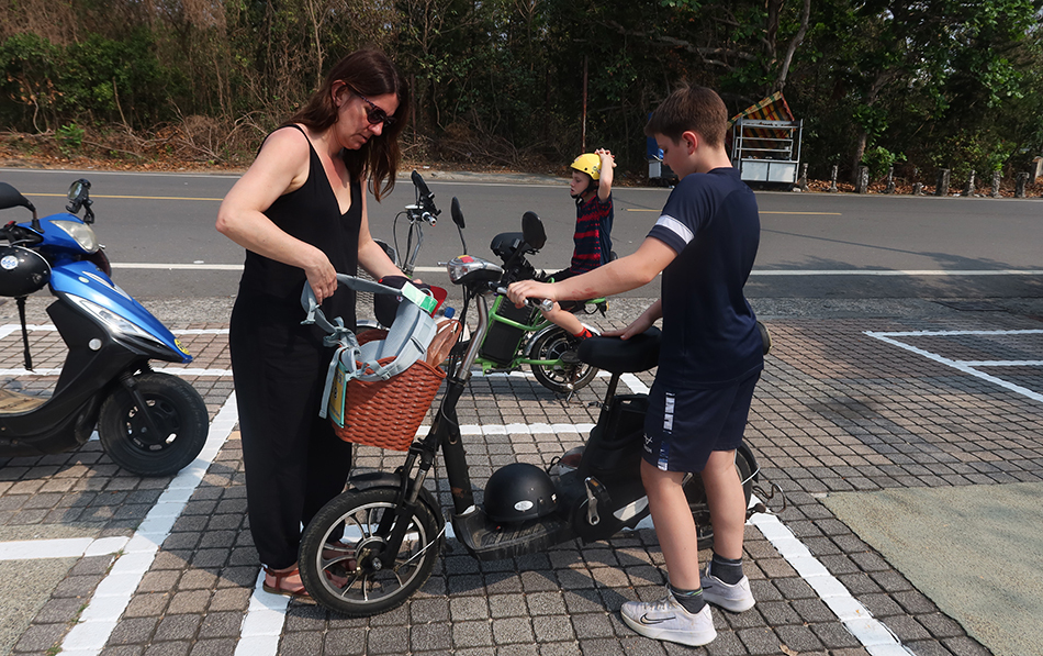 Tweleve-year-old Charlie is too big to sit on the low back of a two-seater, and after a brief discussion, Ruby and I agree he should be OK on the mountain bike and let him go for a test ride up and down the road. He seems to know what he's doing, albeit at a faster speed than we'd like, while dinky Oscar is fine on the back of my machine. The guy says he won't charge us for the mountain bike, which is nice of him.