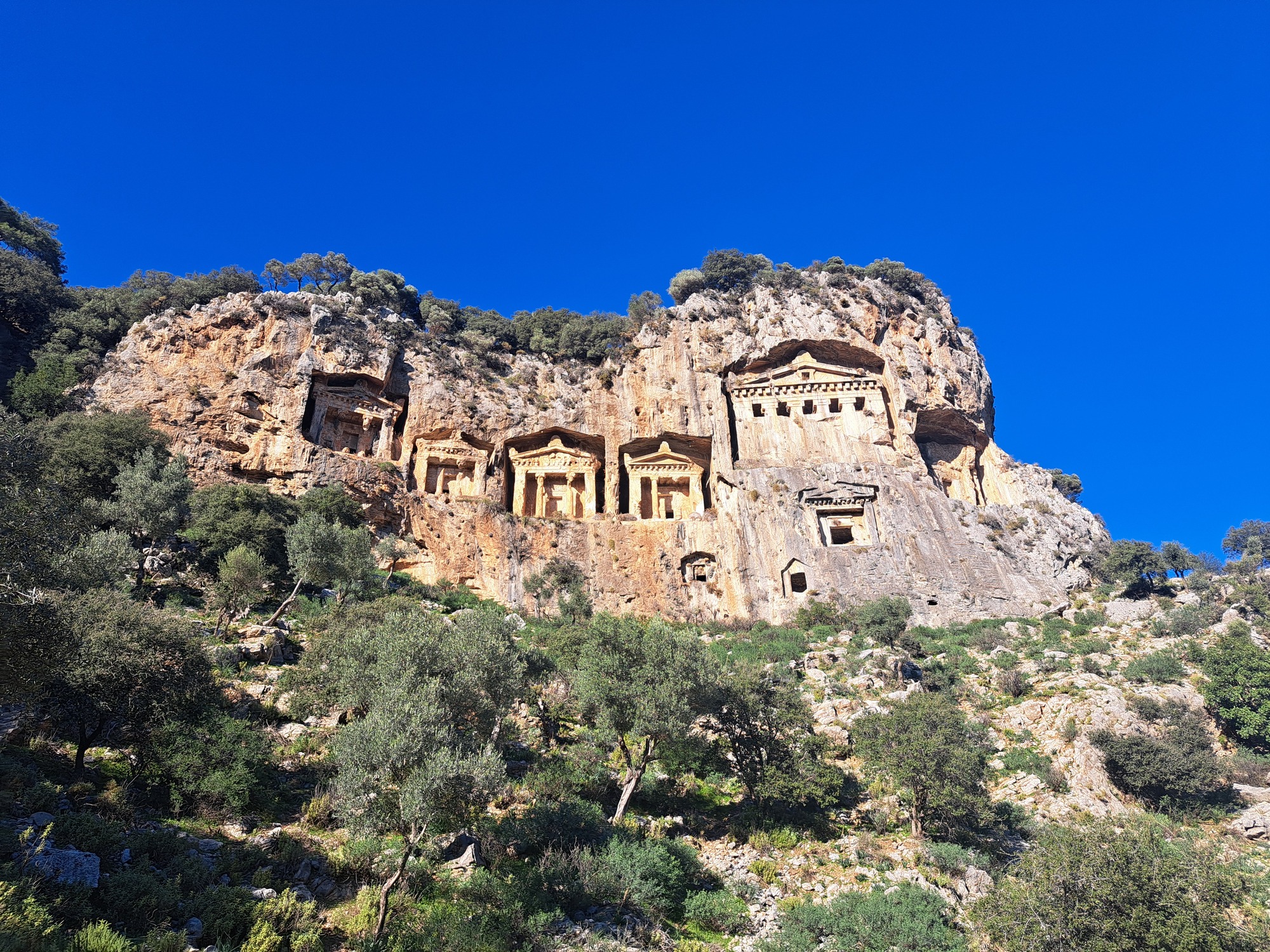 There's also the mystery of how the ancients managed to cut and shape rock with such extraordinary precision and apparent ease, fitting fridge-size blocks together gaplessly, carving detailed figures into temple friezes, and raising self-supporting arches. Take, for example, the Kings' Tombs at Dalyan. How on earth did the Carian civilization burrow into verticle rockface a hundred feet above the ground? And they didn't just dig holes. The tombs they made resemble indented houses with Ionic columns at the front and timpana bearing carvings of animals. At Kapikiri, the Herakleians sliced hundreds of rectangles out of the gneiss to inter their dead, each with its own stone lid weighing tons.
