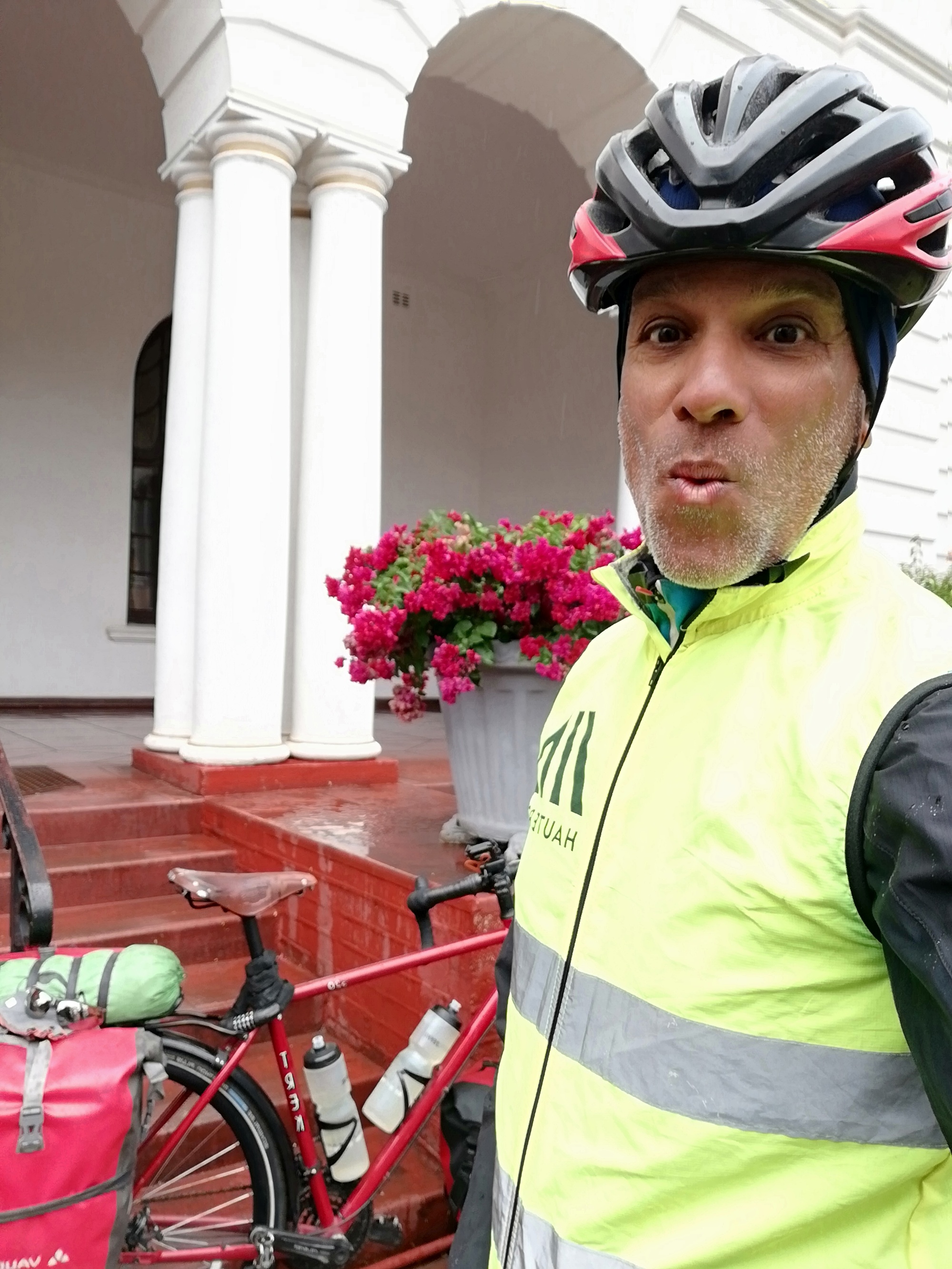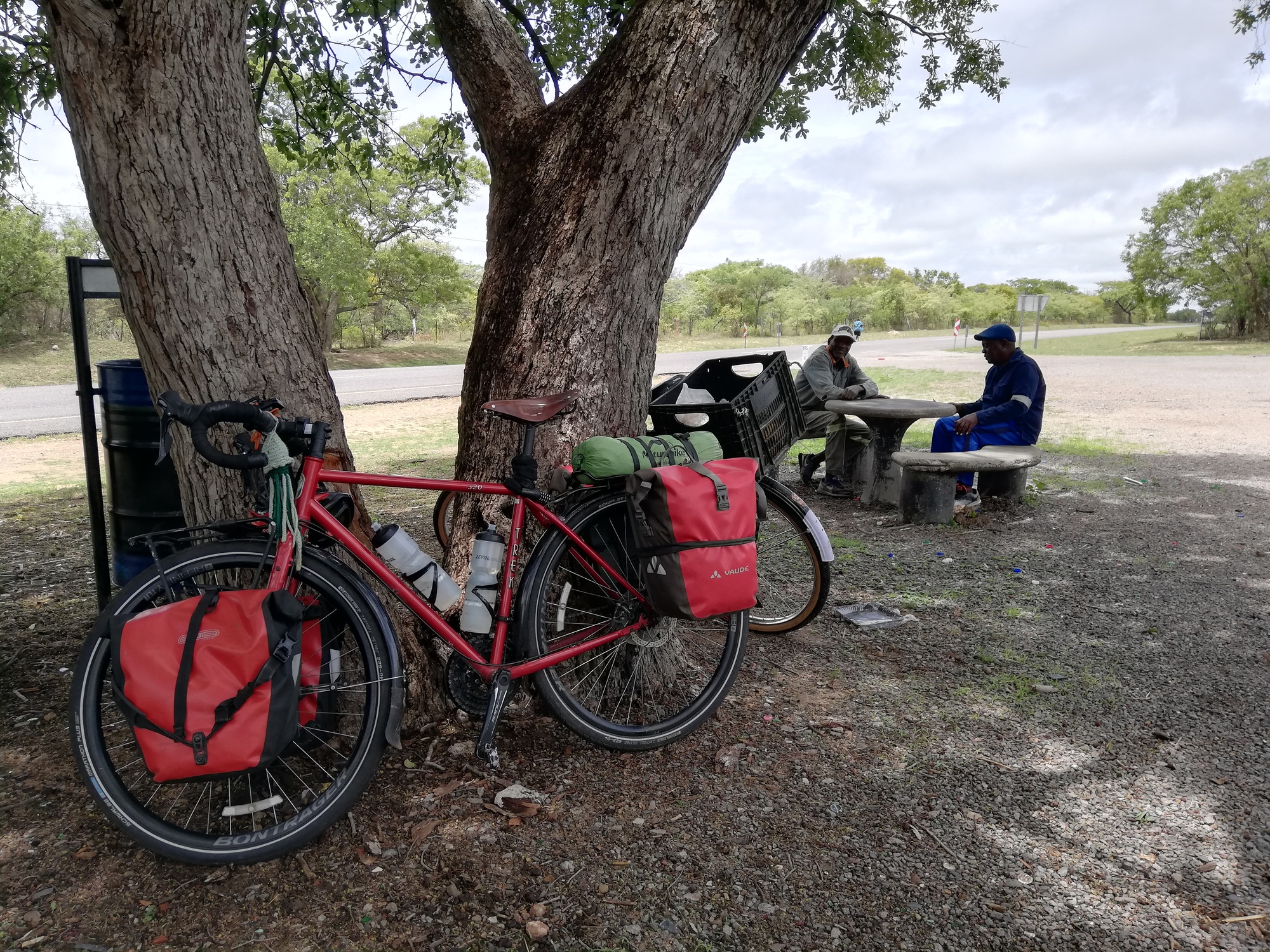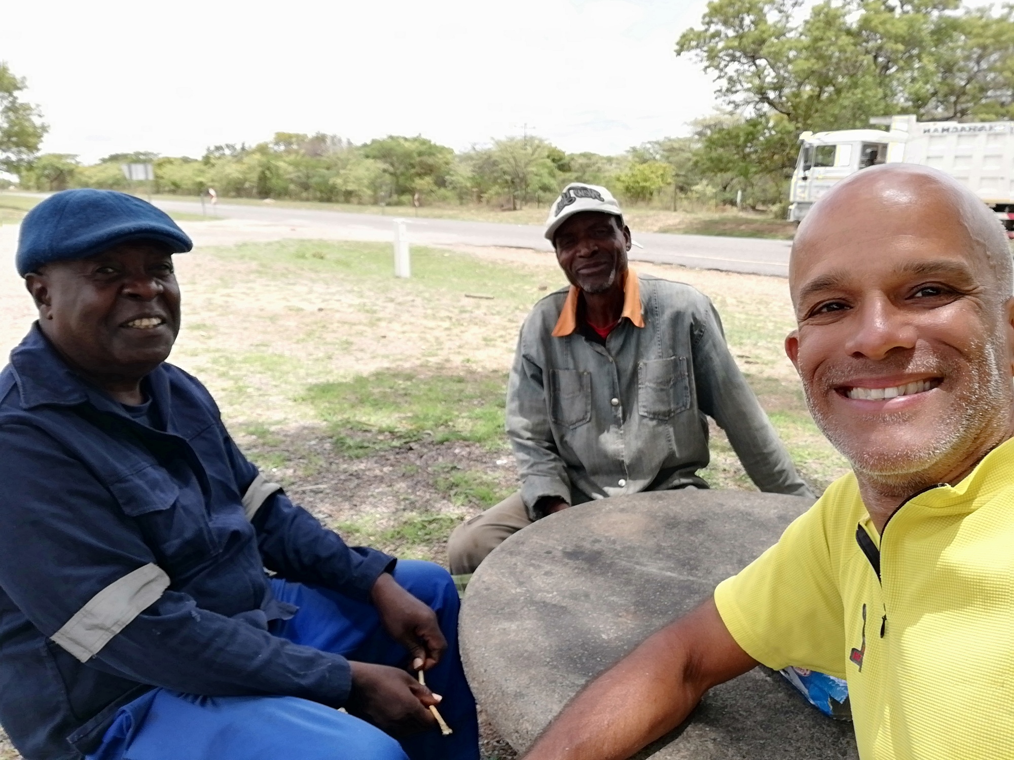 This morning it was raining as I left the comfort of the Bulawayo Club, after a lovely breakfast. The rain forecast was light to moderate rain for about 3 hours, which was completely acceptable. I put on my "Haute Route" high visibility gilet over my goretex rain coat and made my way out of Bulawayo city. The road to Plumtree was well maintained, with very little traffic. A few intercity busses thundered past me on their way to Gaborone in Botswana, as did a few trucks, but not as many as I expected. Trade may not be flourishing as it used to. Passing the small town of Figtree, I chuckled to myself as I suddenly had a craving for a fig- roll biscuit! The rain continued for almost exactly 3 hours (thanks google weather!) and then stopped. I decided to have the bacon-butty that I had taken away from breakfast this morning, so I stopped at a picnic stop under a large Msasa tree. There were two gentlemen sitting at the picnic bench so I joined them and shared my packet of custard creams with them. We chatted for a while and exchanged life stories while we chomped on biscuits.