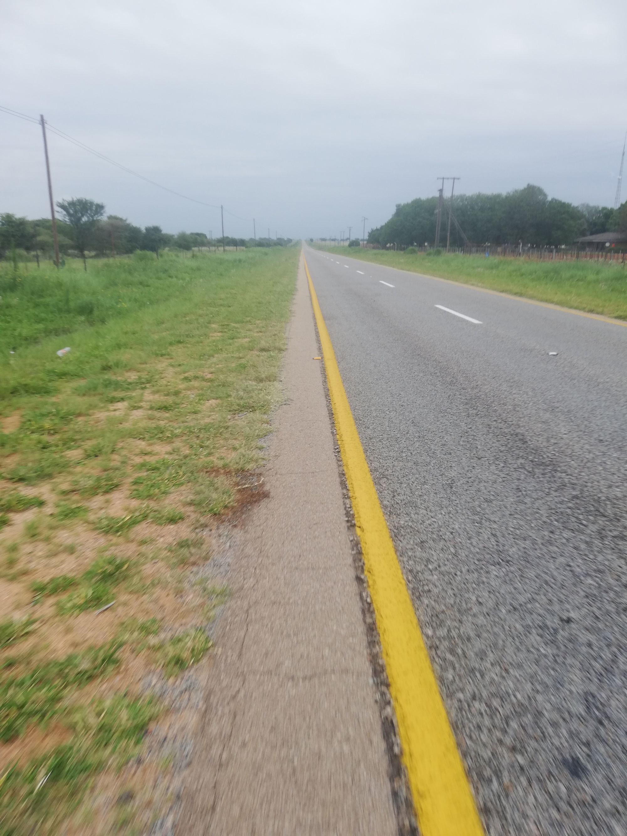 Leaving Setlagole village, I turned left at the junction to rejoin the N18 South bound. Infront of me dark clouds loomed, and I struggled against a head wind from the start. Dark clouds in front of me and a wind blowing in my face spelt one thing: a trickle of rain was heading my way. I don't like riding in the rain, but rainy days are commensurate with being on a bike tour for this length of time. It is inevitable, especially when it's the rainy season in Southern Africa! Rain shouldn't scare or distract me because it is an uncontrollable. The controllables are the right clothing for rain, high visibility gilet, waterproof panniers, lights and a well maintained bike that handles well in wet conditions. I had all the controllables, so shouldn't have felt any dread. But human nature will prevail, and I found myself slightly nervous at the prospect of wet kilometers.