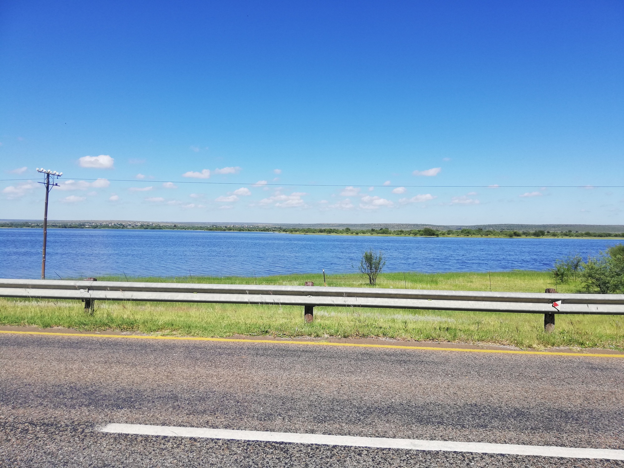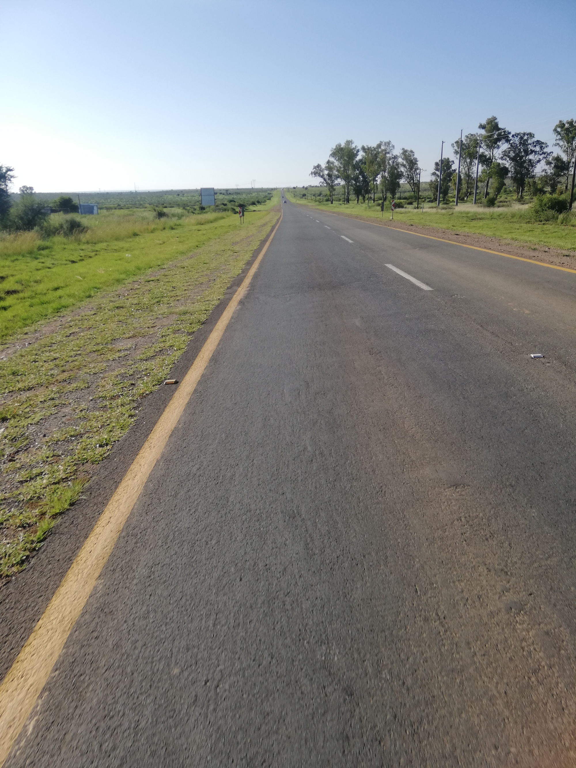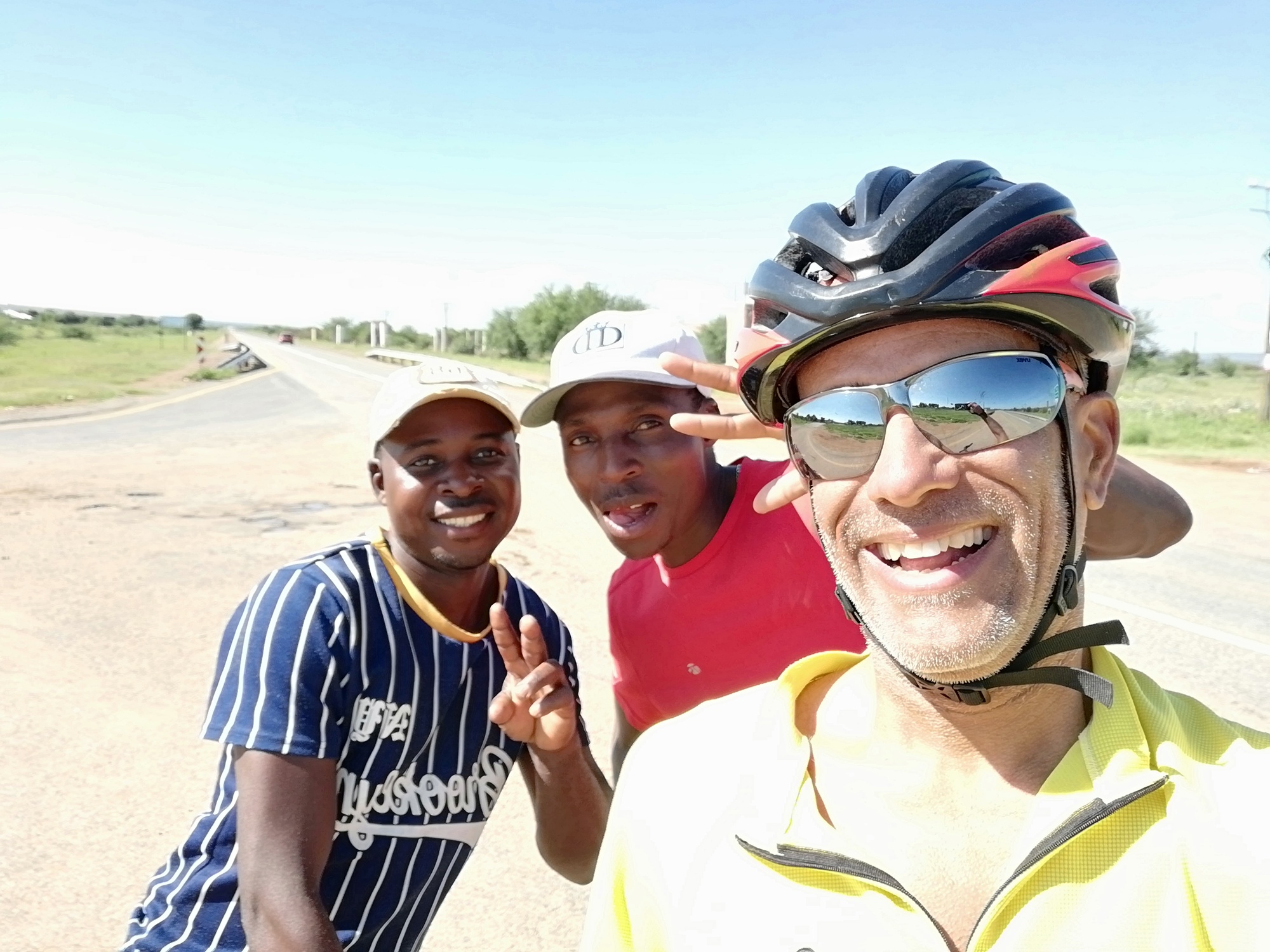 Riding out of Vryburg was pleasant in the fresh morning air, and I was soon on the main road out of town. Almost immediately, I encountered large farms on either side of the road. These were big farms, some with livestock some just crops, and the signs of wealthy farmers was evident: expensive farm equipment out on the fields, electric boundary fences and security guards at the main entrances. The cows were so cute, all staring at me, and holding their stare in unison as I rode past. I stopped at a junction when I was called over to by two young men. They just wanted to talk about what I was doing and take a few selfies for their social media. I willingly posed with them and they were so excited, even more so when I asked them for a selfie for my social media! "Be blessed our brother... safe onward journey!", one of them exclaimed as we parted.