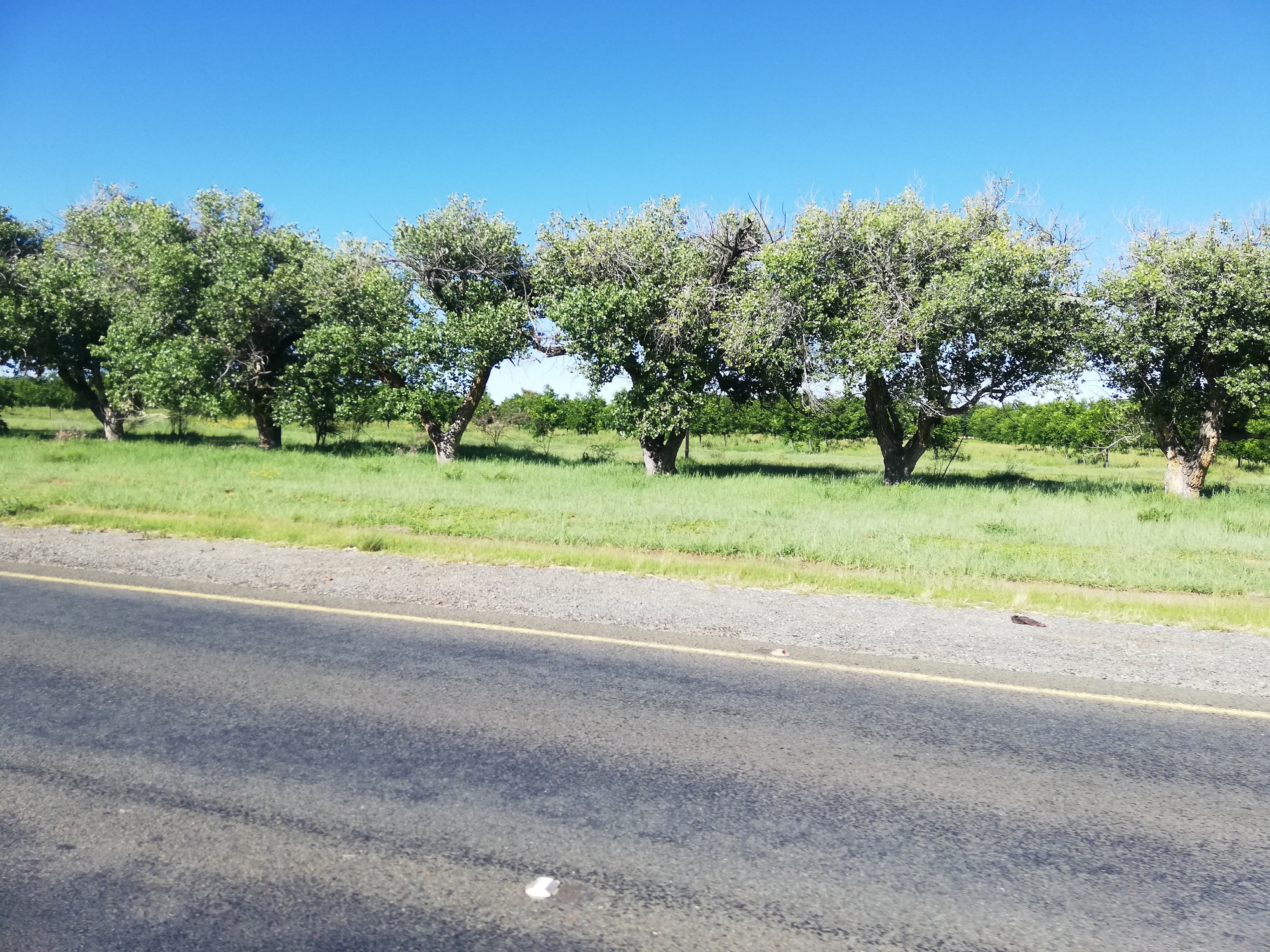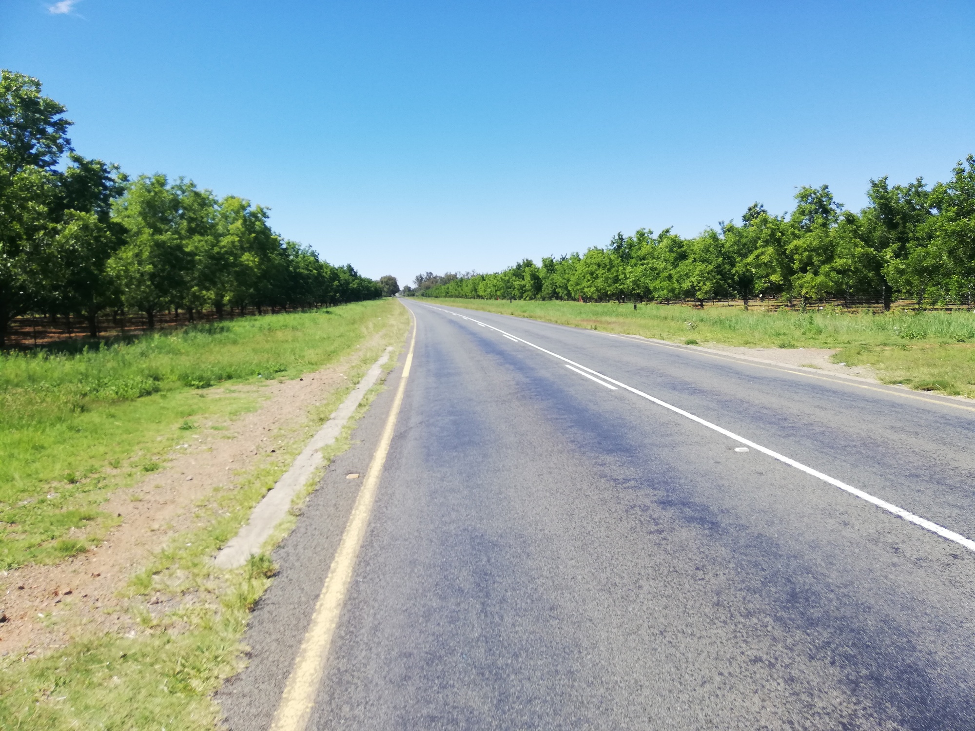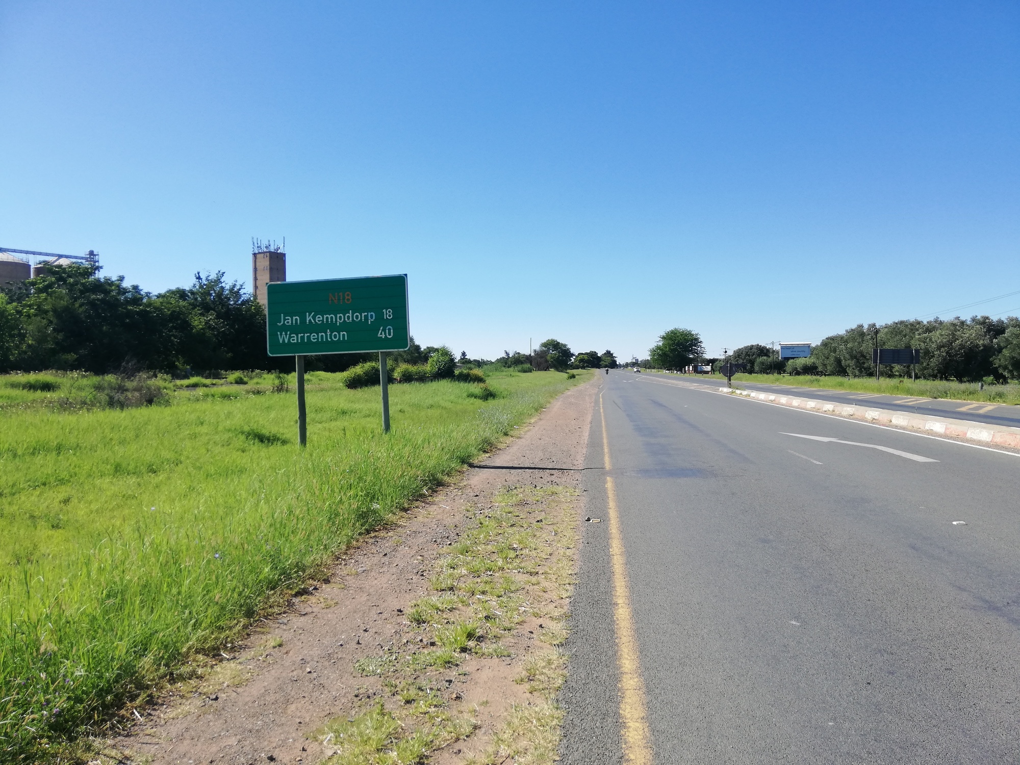 Yet again, I was glad to have planned a short day today. 64km to Warrenton, albeit with a 50km gradual climb and moderate head wind. The ride was spectacular. The N18 took me right through some amazing commercial farms which I found very interesting. Vast fields of orange trees, olive trees, pecan nut trees and wheat, with state of the art irrigation systems and farm machinery all in place for passers-by to see. I was impressed. The wheat and olive silos were enormous. This was commercial farming on a scale that I had not seen in Africa. I assumed most of the produce was for an export market. Watching all the farms and associated greenery made the ride most enjoyable, and to top it off, the N18 became wider!