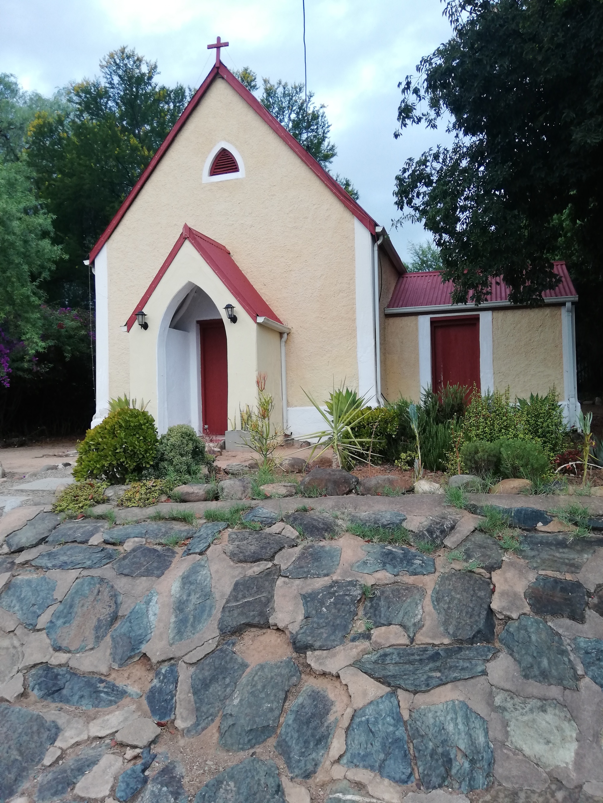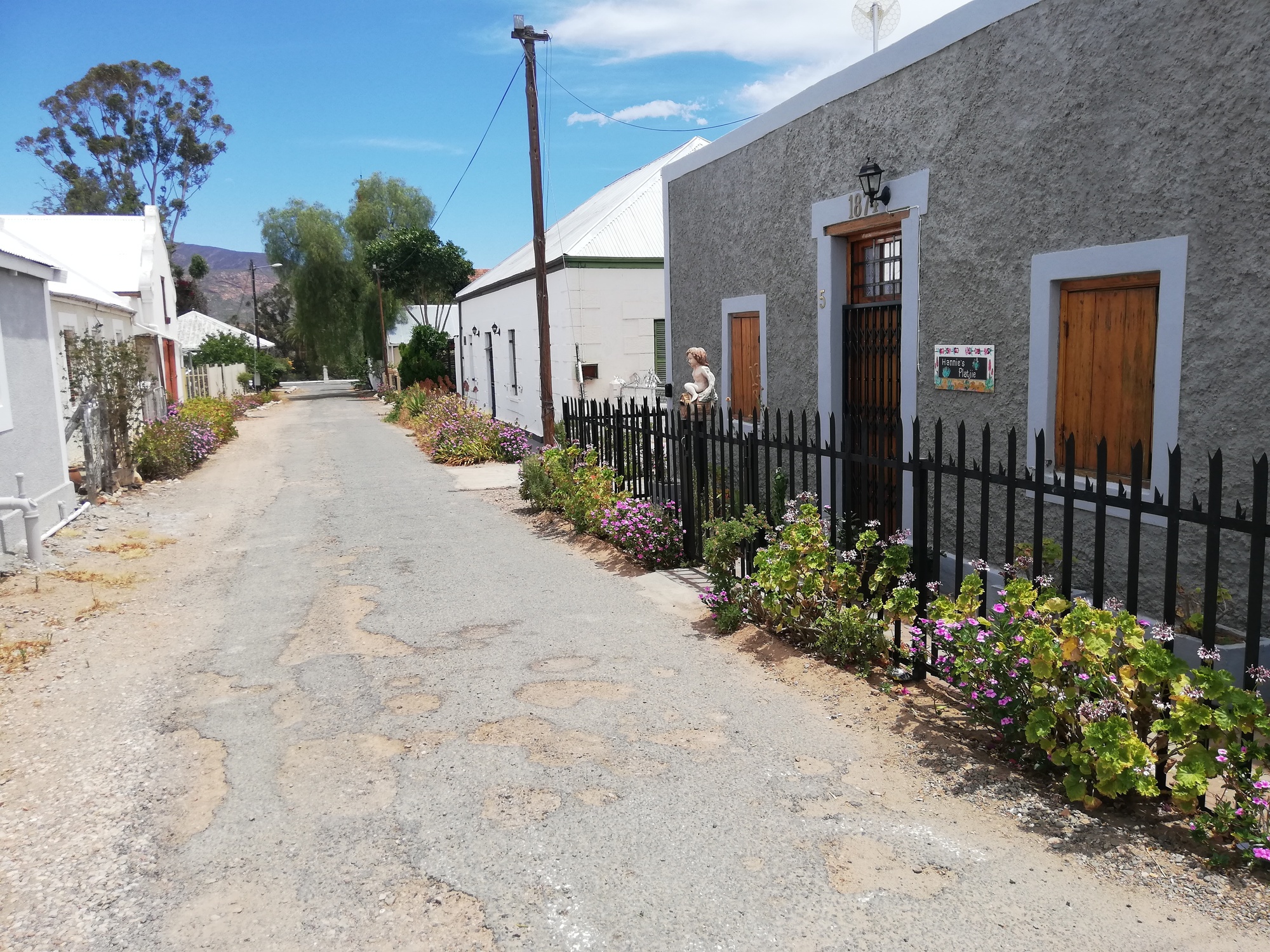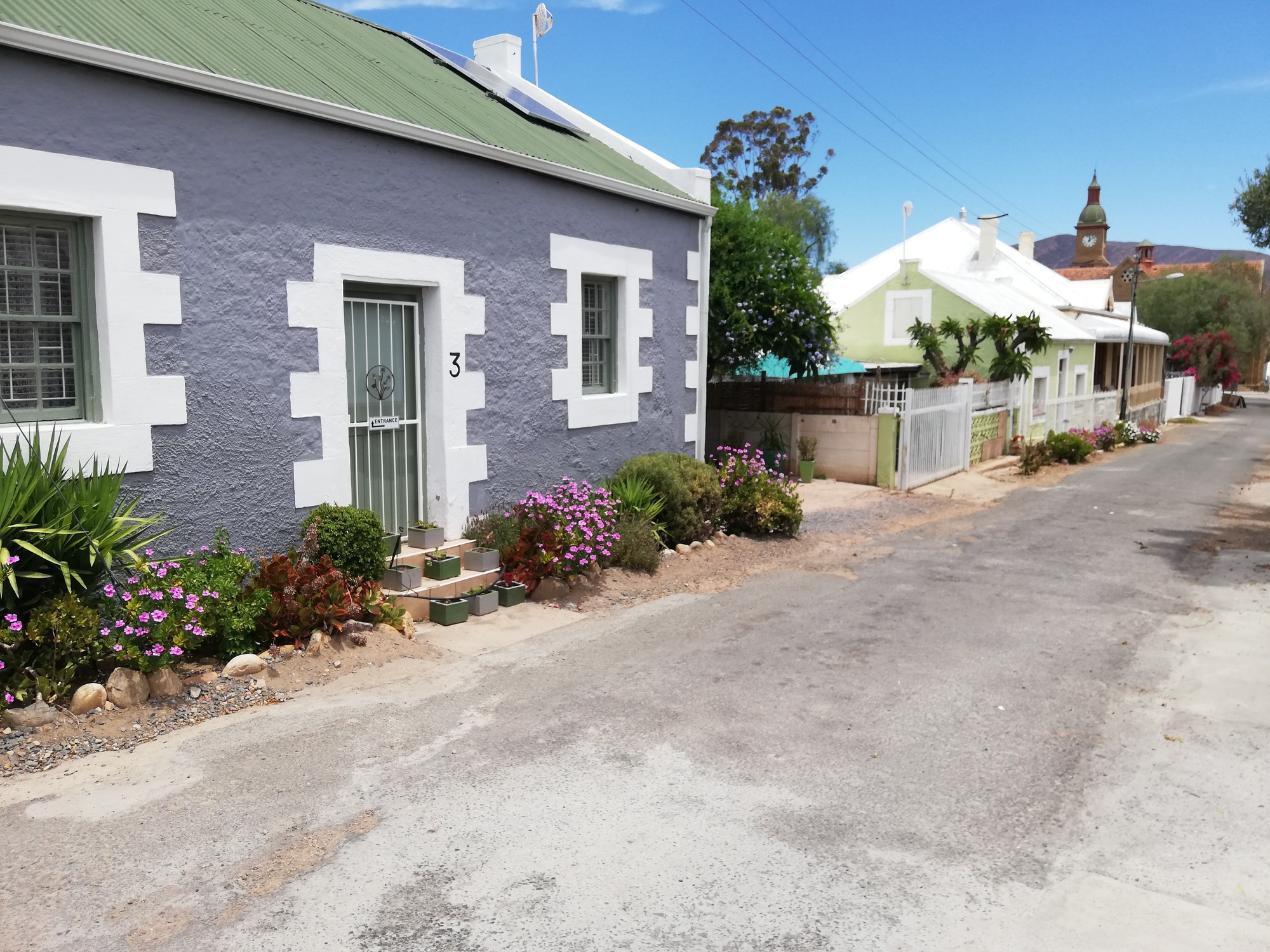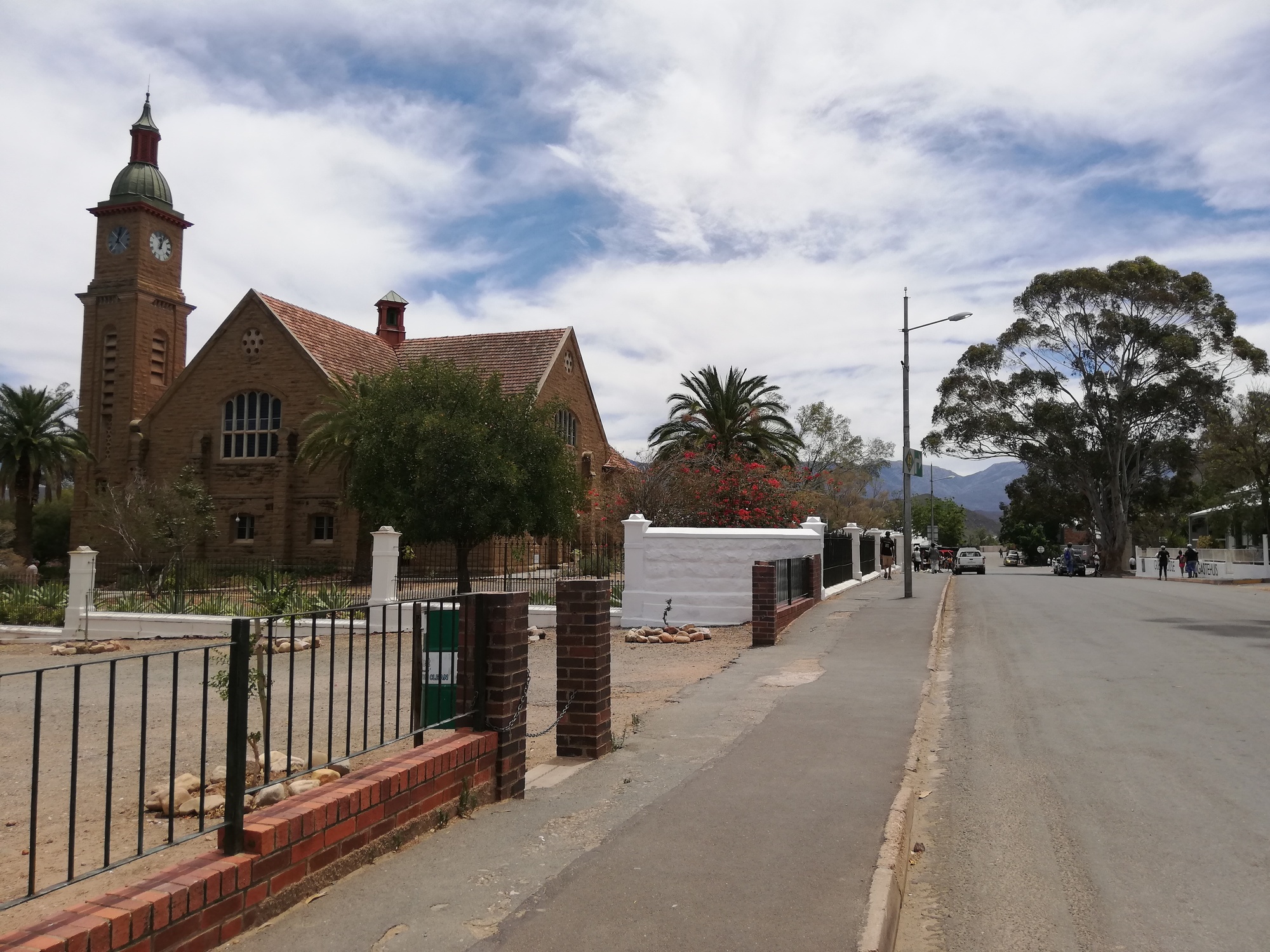My destination town was Calitzdorp, which I reached after an uneventful but scenic ride, just before midday. This suited me, because I planned to do a historic buildings walk and visit the town museum before the mid afternoon heat arrived. I managed, and enjoyed both. Calitzdorp is a small Karoo town with 6 or 7 streets arranged in a grid pattern around the impressive Dutch Reformed Church, which is built in sandstone and towers over the town. The bells of the church still chime correctly on the hour, and the clock displays the correct time. The historic buildings are now either peoples homes or guest houses, or wine cellars offering wine tasting, all still preserving the beauty of 1800s architecture. I was impressed at how much there was to see in this tiny town. After dinner, I strolled along what was labelled as "historic walk 2", and enjoyed more architectural beauty, before settling down for the evening. A regional power cut made the evening slightly unpleasant: no lights, no fans, lots of mosquitos taking advantage of the dark rooms with no airflow. The guest house owner said the high winds today had brought down powerlines. I decided it was going to be another tent-in-room night given the mosquito situation.