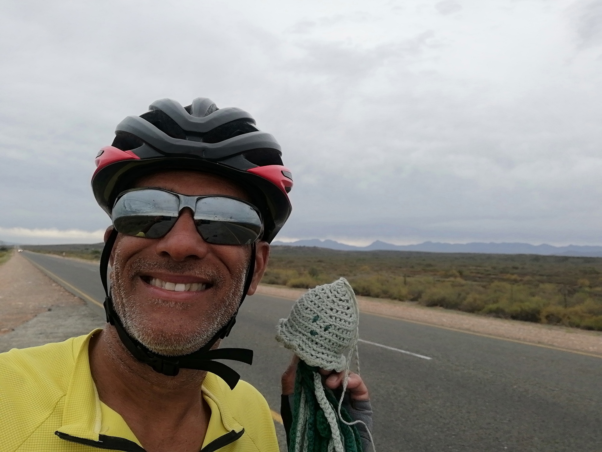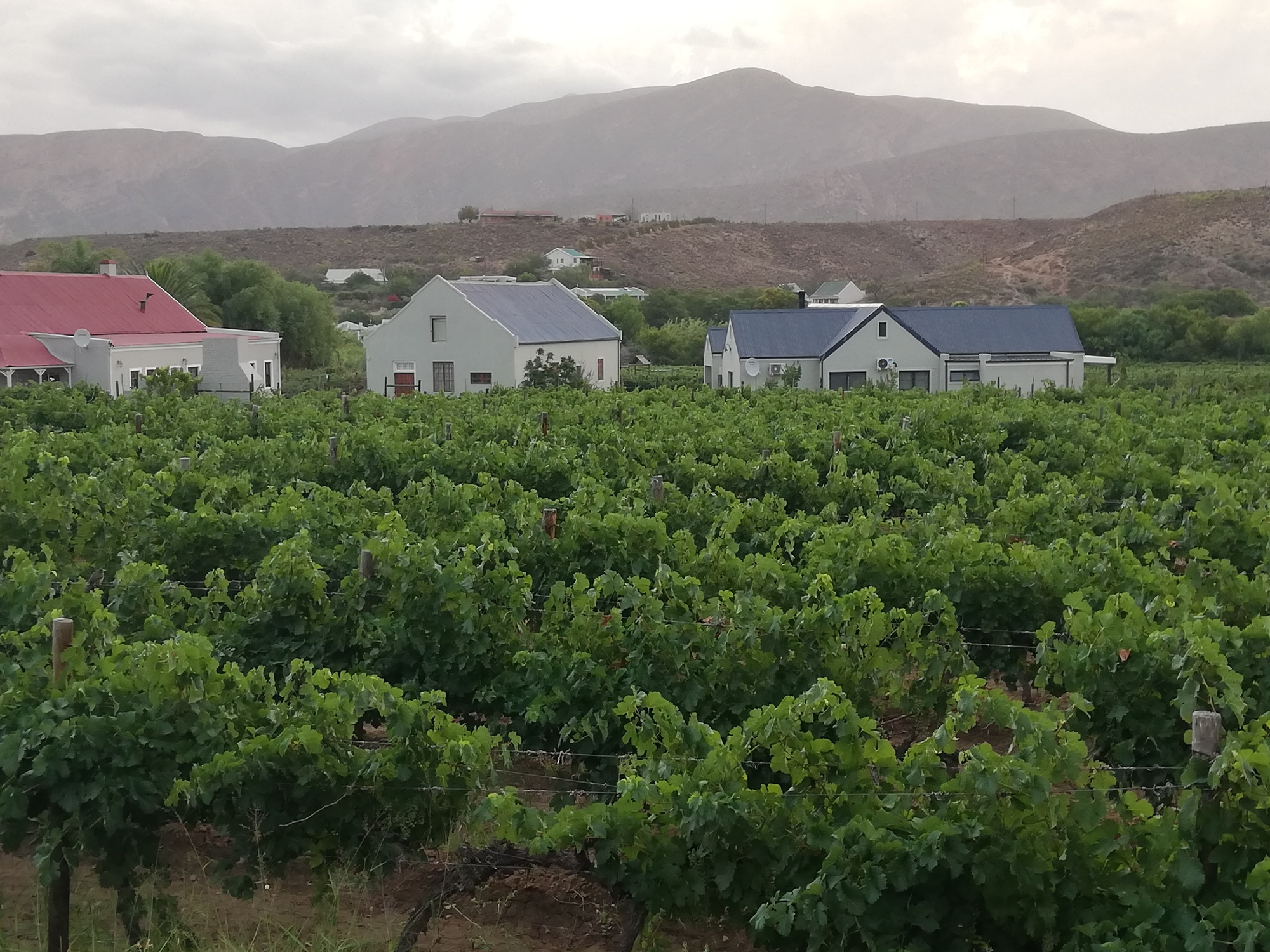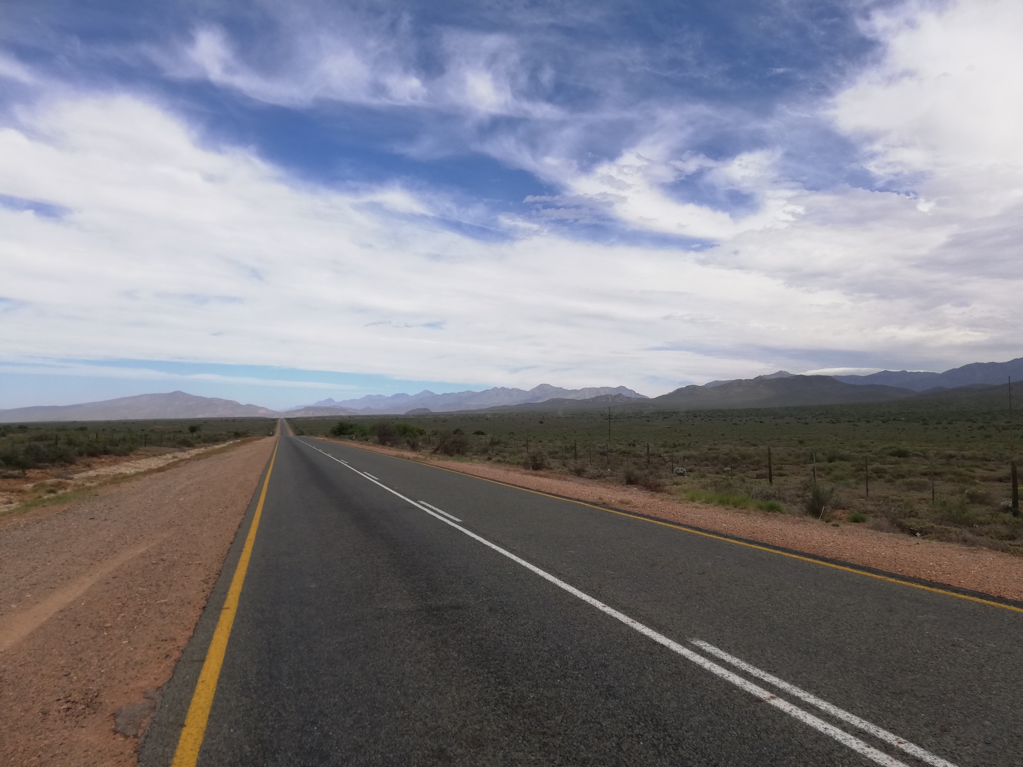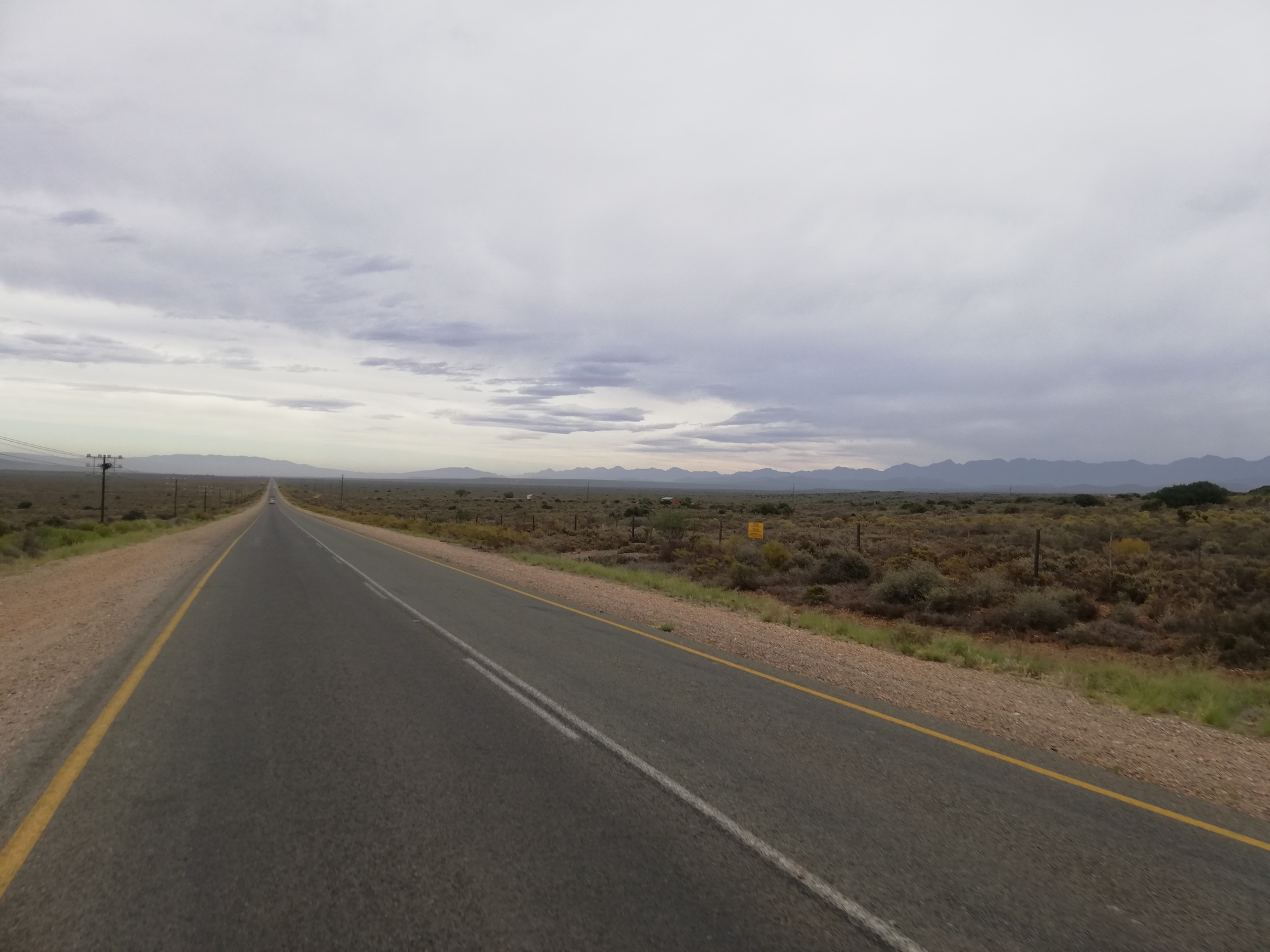 Today, for the first time in weeks, I started heading West, through the Klein Karoo, towards Swelllendam. It was quickly clear to me that the Klein Karoo was very different to the Great Karoo. The former was greener, hillier and more agricultural. I spotted vineyards in the distant hills, and related sign boards advertising wine tasting stops just off the main road. I was now on the R62, also known as Route 62, which is a scenic route through the Klein Karoo, known for its greenery and hilly landscape resulting in some stunning views that I looked forward to over the next few days. Today was an undulating route made slightly more challenging by a strong head wind. Thankfully, I allowed myself the luxury of a 51km day, so didn't anticipate fighting the wind for too long.