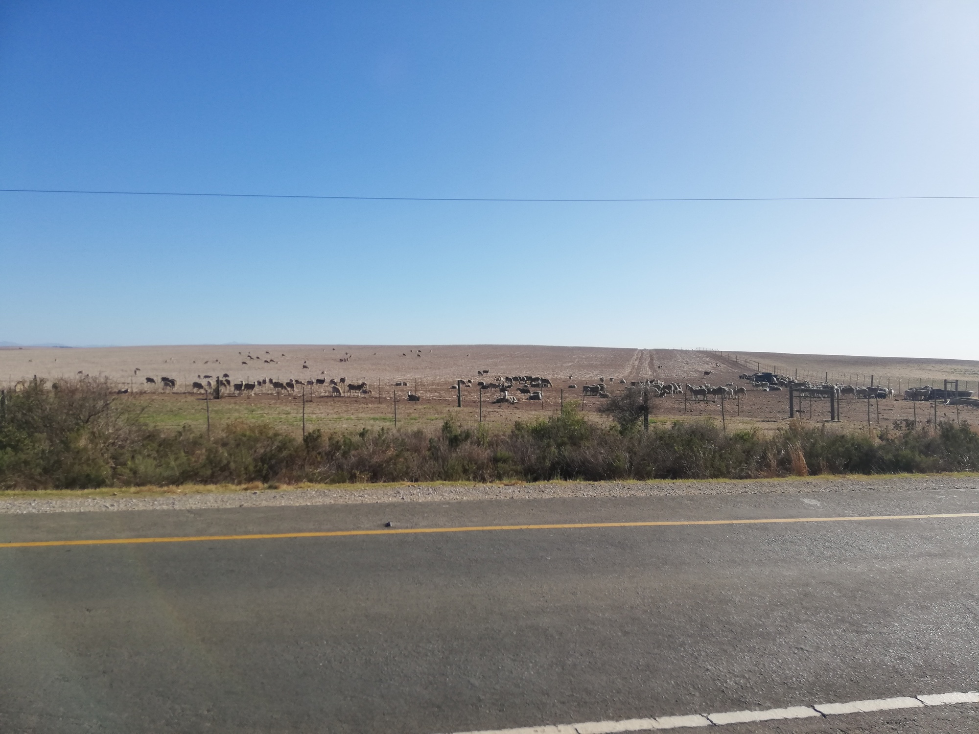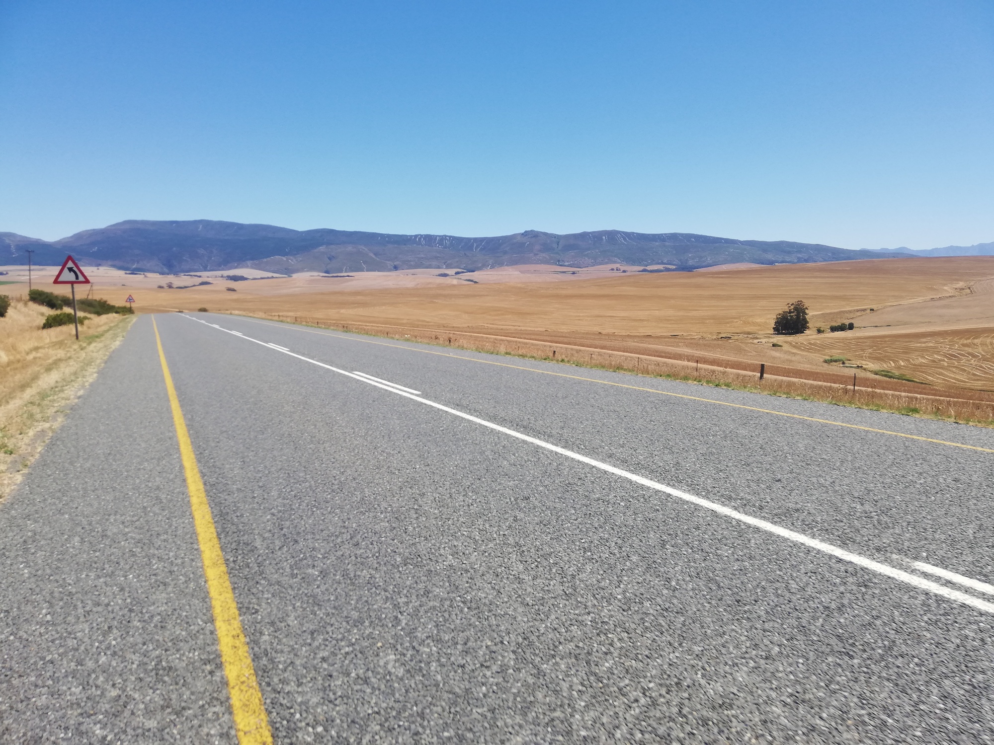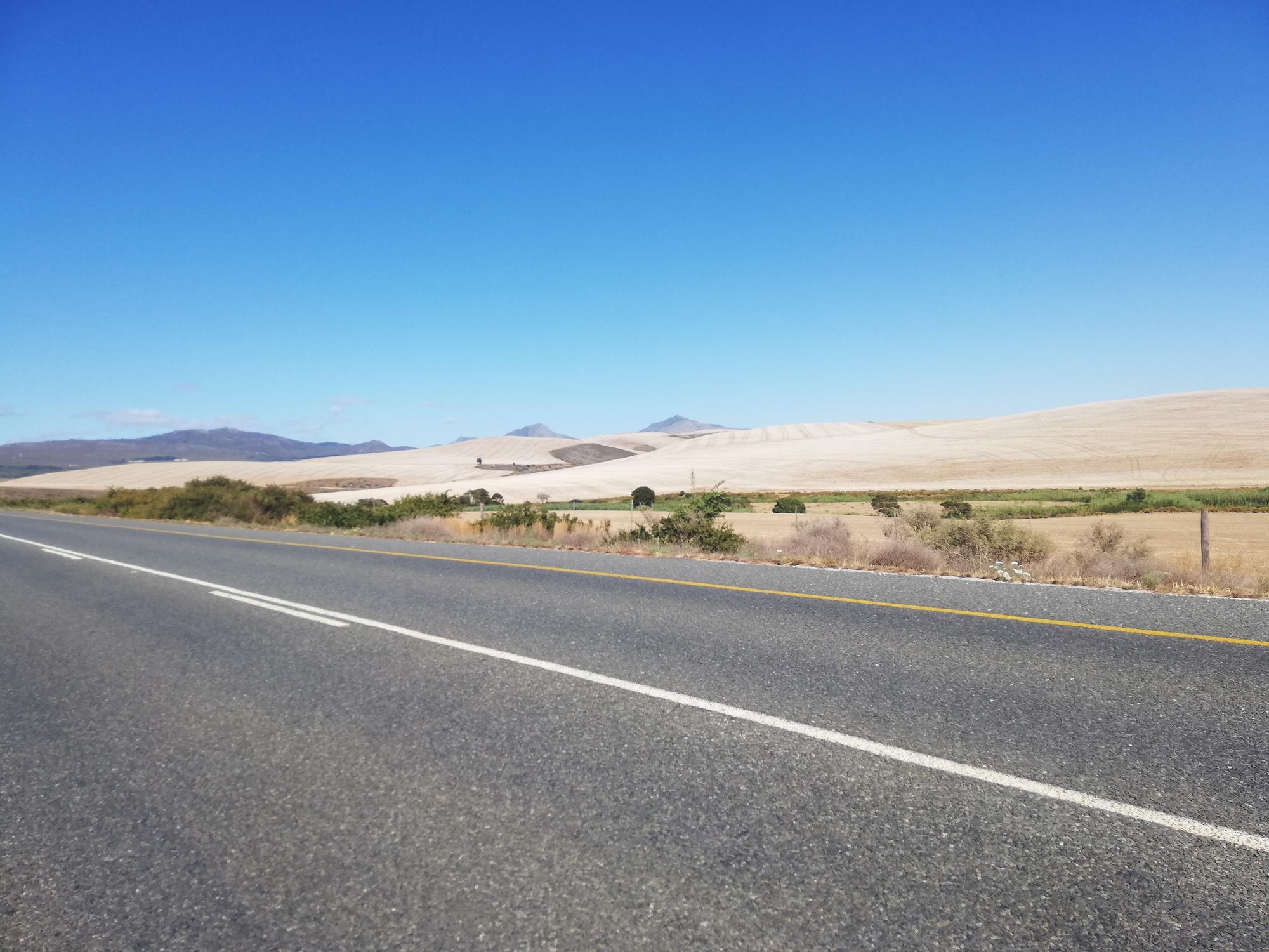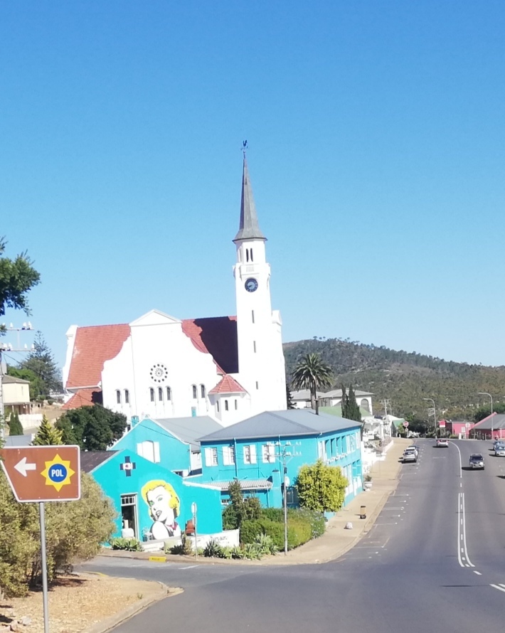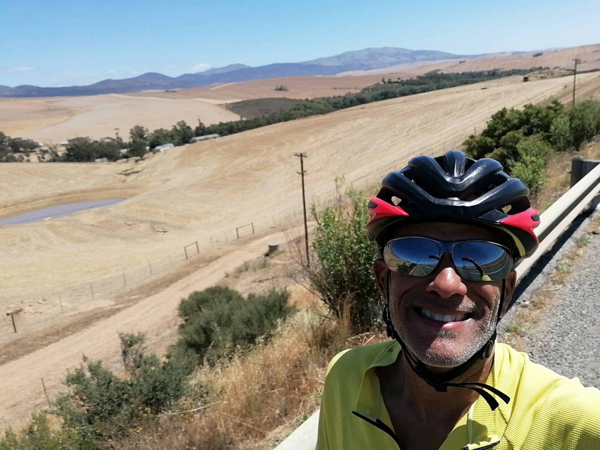 Today's route had no flat sections. It was either up or down for the whole day. A mild tail wind, and an absolutely beautiful 23 degrees under a clear blue sky made it an most enjoyable day despite the constant sharp climbs and steep descents. Granny ring got a lot of usage today for sure! The scenery today was stunning and completely different to the mountains of the last few days. I rode through a delightful town called Napier, with its tree lined streets and colourful buildings. The open road took me through vast acres of wheat fields and grazing lands, with more hills as far as I could see. Motorists hooted at me in encouragement and one particular lady in the passengers seat made me jump as she screamed something in Afrikaans really loudly as her car passed me.