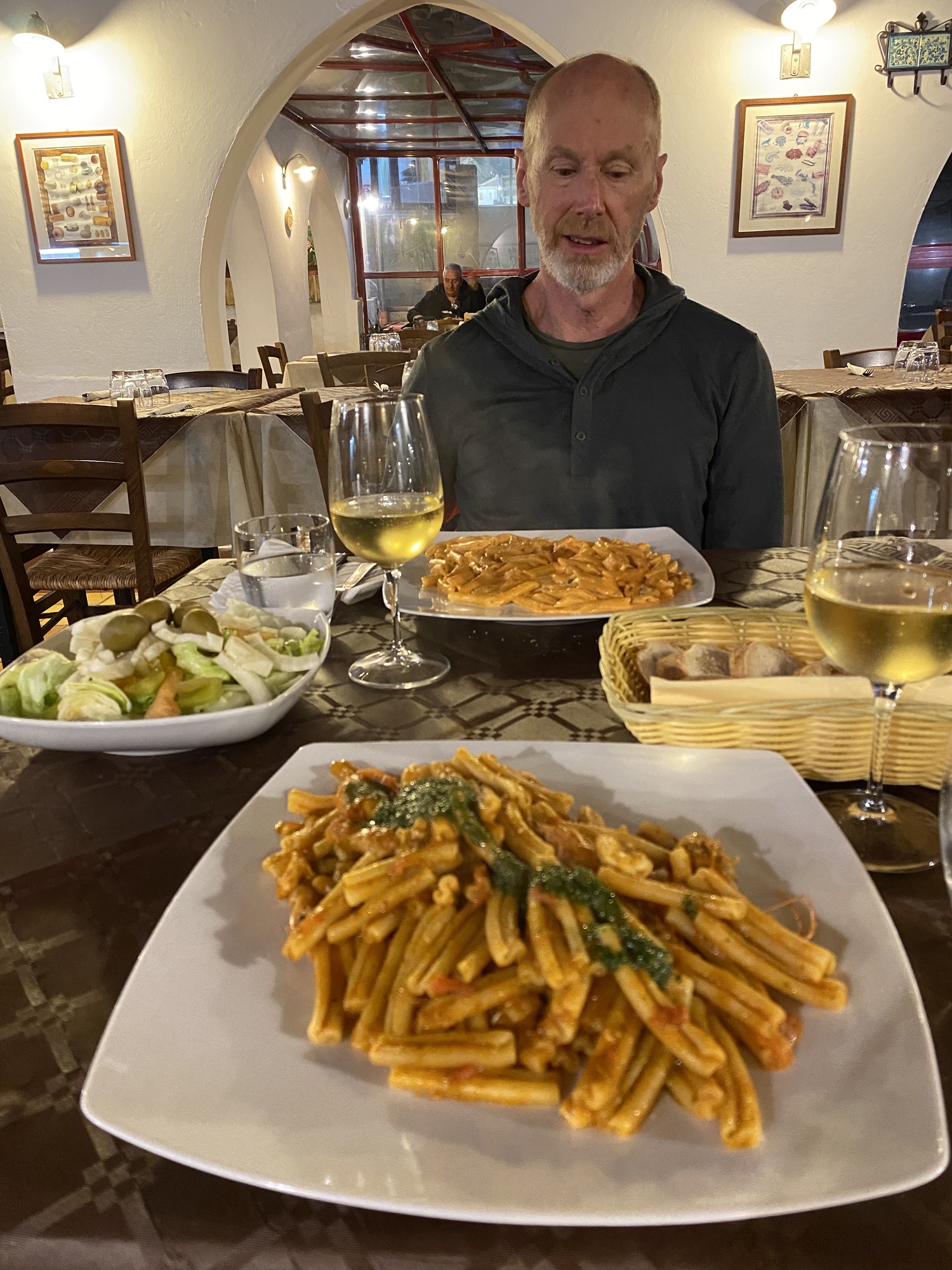 For dinner, our hosts strongly suggested a restaurant called Baio in Lido Rossello, 3 km up the road to the west. I’m not sure if they thought it was the best or merely the best of the close options. We did see one of them picking up takeout pizzas there as we were finishing our meal. Although it was empty when we came in at 7:30 (opening time), it was packed when we left. We didn’t think the food was particularly special, but it was certainly okay.