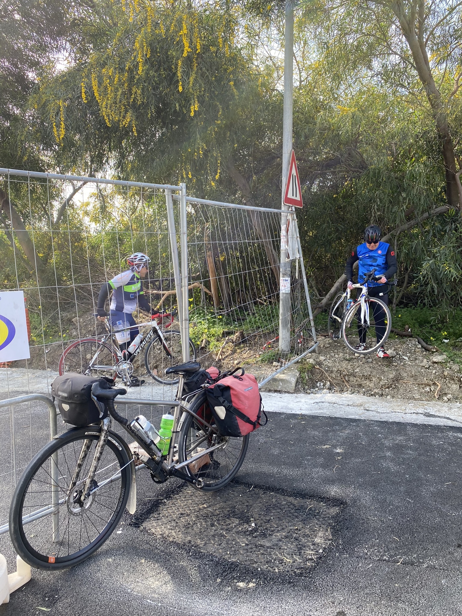We left Sciacca on the SIBIT cycling route and came almost immediately to a stop. Another bridge closed! We were of course at the bottom of a descent and not pleased at the idea of riding back up, but a quick check showed no other way. Just as we were about to give up and turn around, Al spotted a cyclist coming towards us across the closed bridge. And he had several friends. They showed us how to get around the barrier and assured us it was fine. Great!