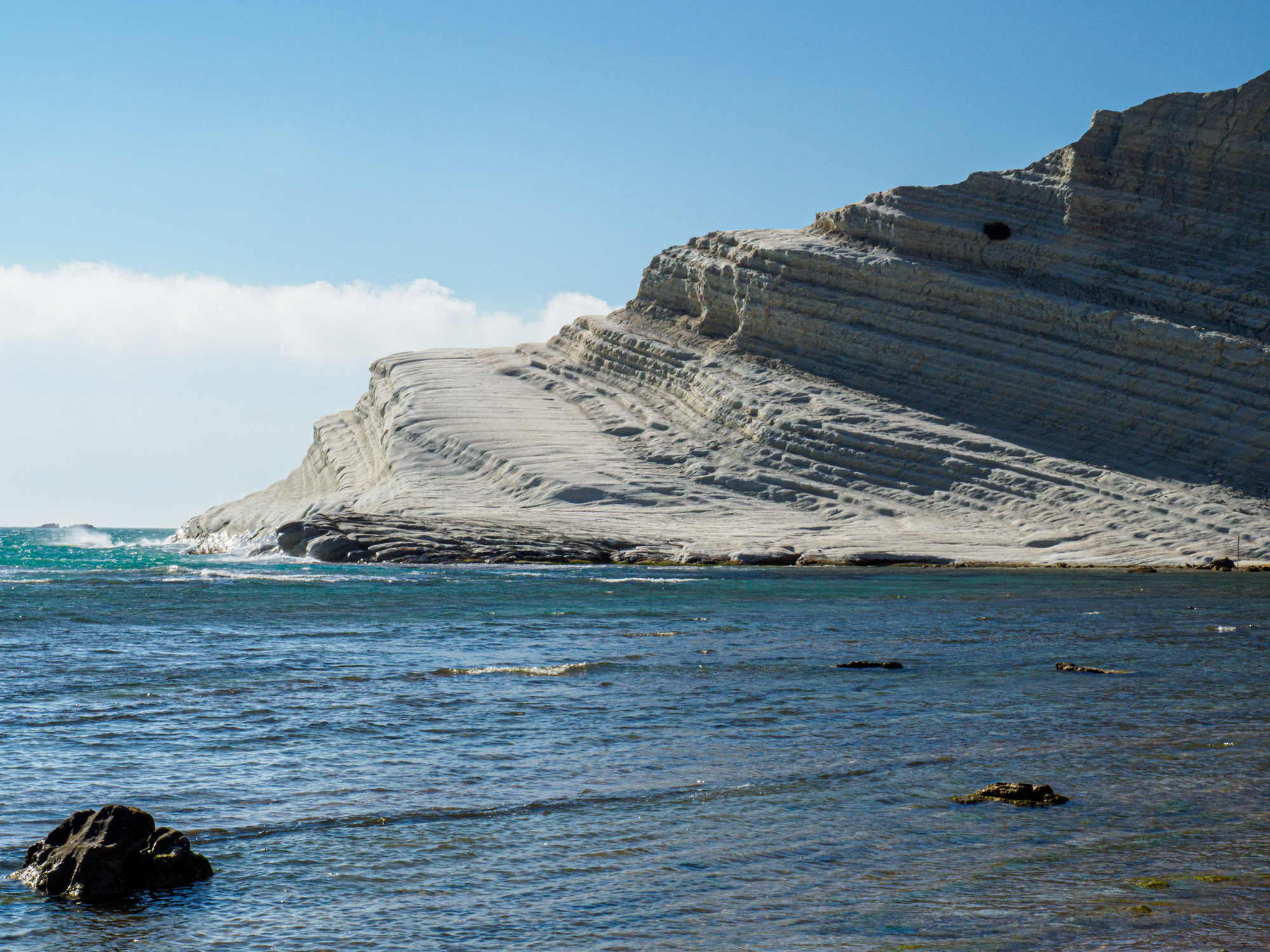 Our accommodation here was chosen because of its location (within an easy walk to Scala dei Turchi) and its price (though one of our most expensive nights, about the lowest I could find in the area). The room itself was rather sad. Small, with barely enough water pressure to take a shower, and not potable water to boot! But the hosts were very welcoming and friendly (and potable water was provided). The other disappointment was that the Scala dei Turchi were closed for stabilization work. I’d read other cyclists’ journals and seen comments of open/closed/partially open, so I knew it was a possibility that they’d be closed, but when I looked on the official website later, it states most specifically that “In questo momento il sito non risulta chiuso al pubblico” which translates to “At this time the site is not closed to the public.” Oh well. A few photos anyway: