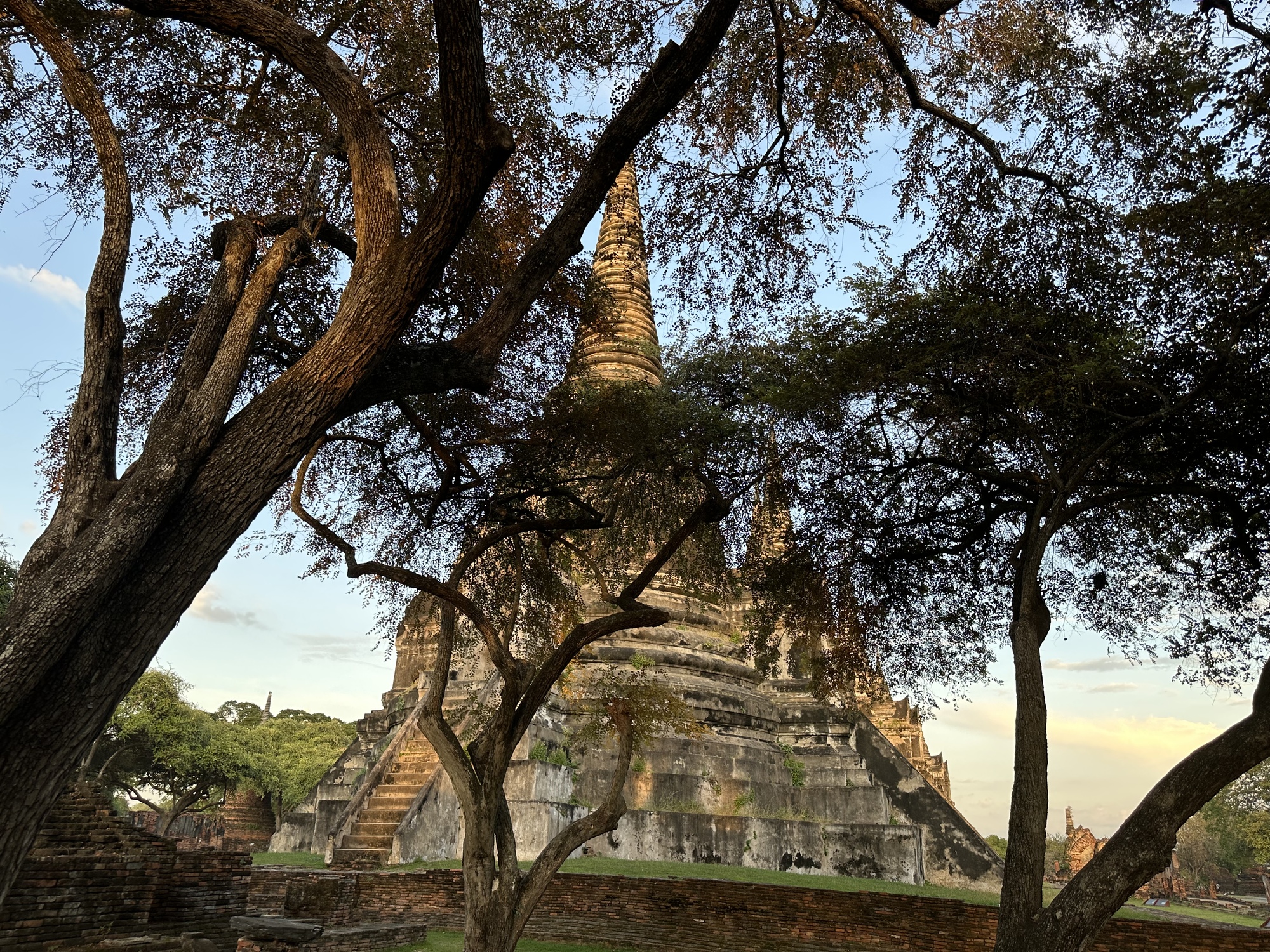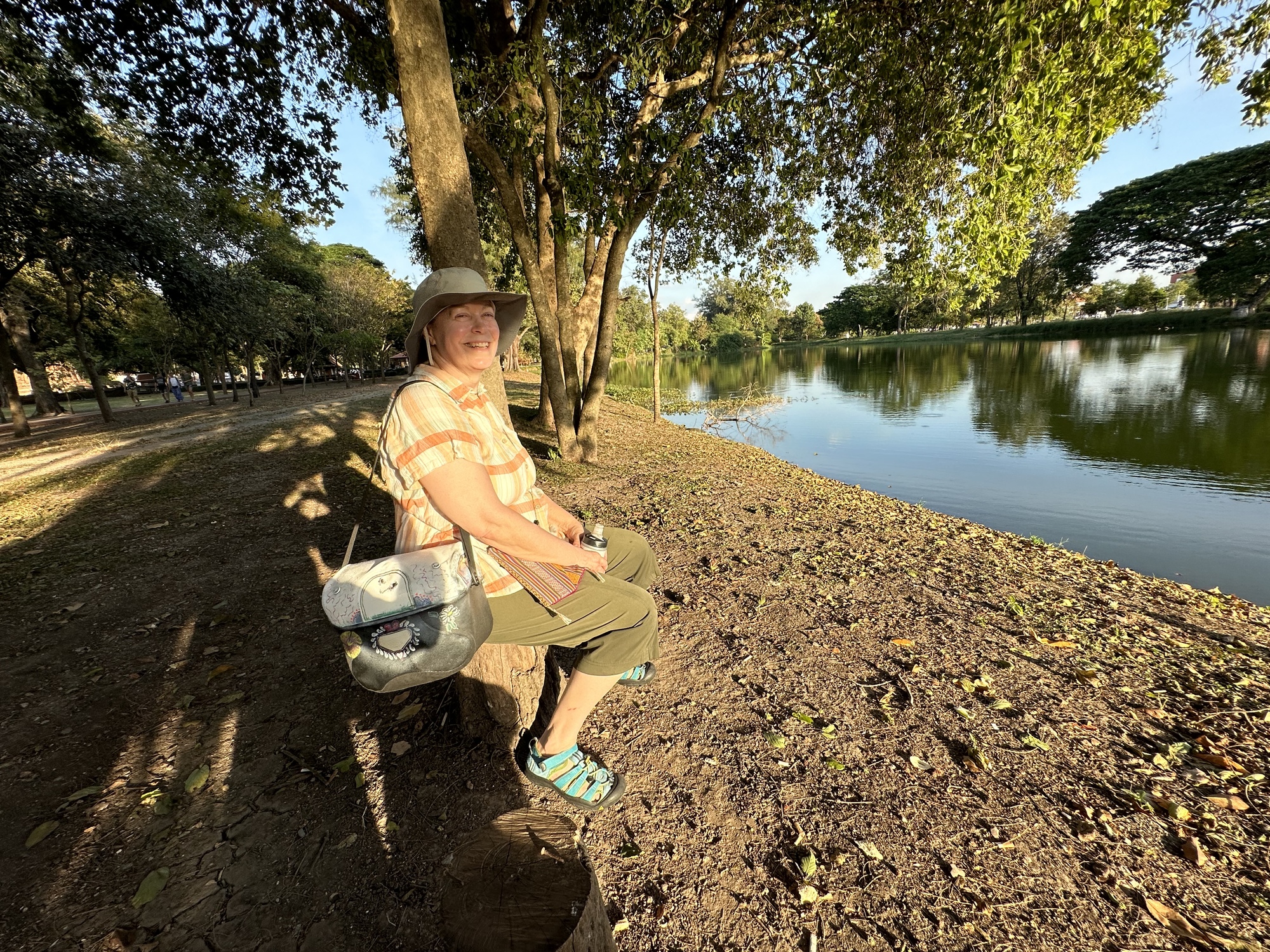 Because of past misadventures with excessive heat and humidity we spend afternoons in the air conditioning until we can go out without frying. The evening light in the temple grounds was beautiful. Ayutthaya is an ancient site that seems more lovely than Sukothai because of its trees. I like ancient temples, I like trees and wildlife even more. We saw monitor lizards schlepping around by the ponds and marveled at the incredible bird calls we were hearing.