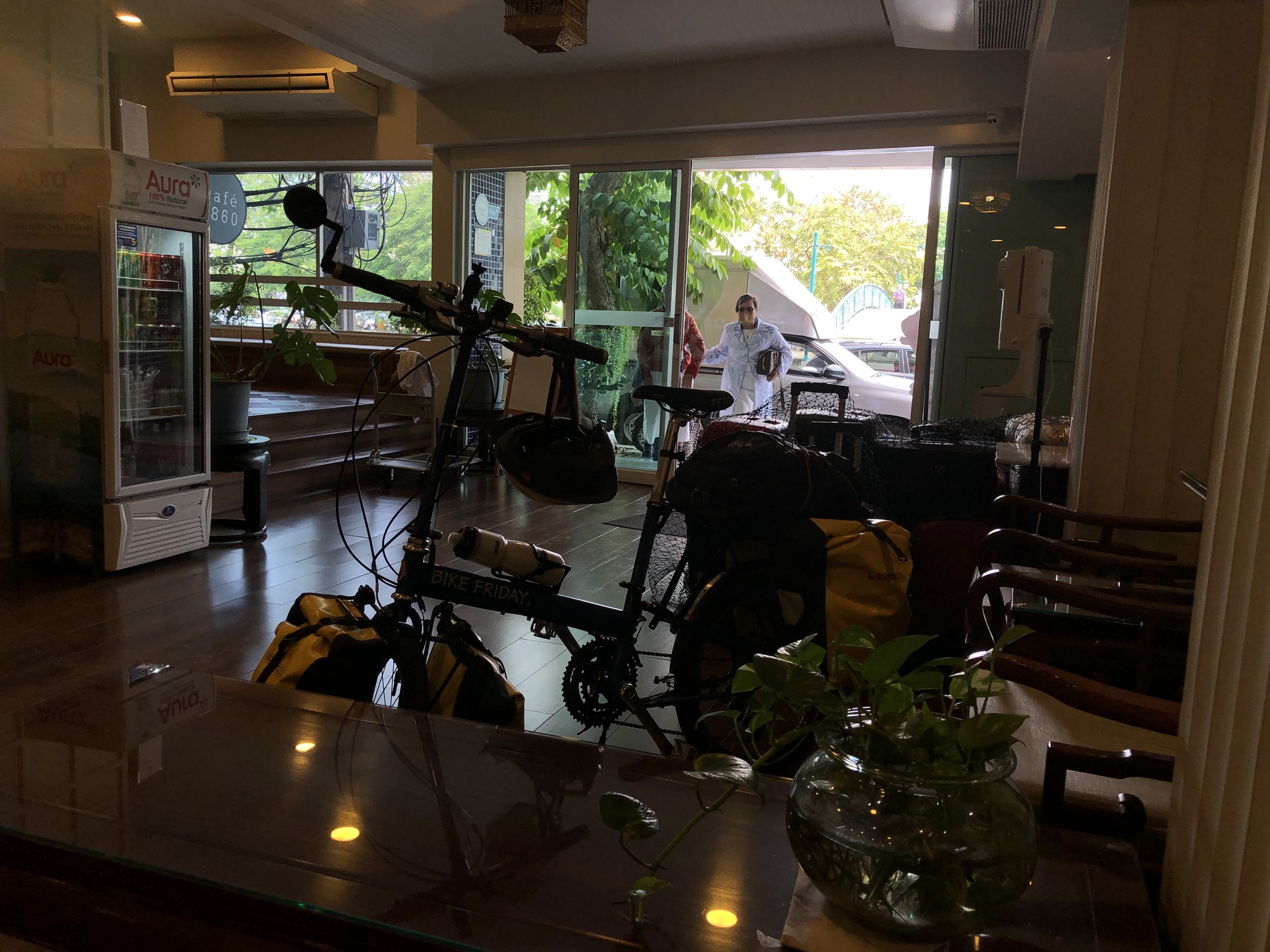 This hotel is huge, has very basic rooms, and an elevator that barely fit our bikes. It did have a great view from the fifth floor to the east and Hualumphong station. We were not feeling enthused about the so-called “free breakfast” but it turned out to be a feast! Jok, curries, eggs, toast, fruit, coffee, juices, vegetables, and endless array. While we love ourselves a breakfast buffet I think Bruce has a special hollow leg he brings out for such occasions.