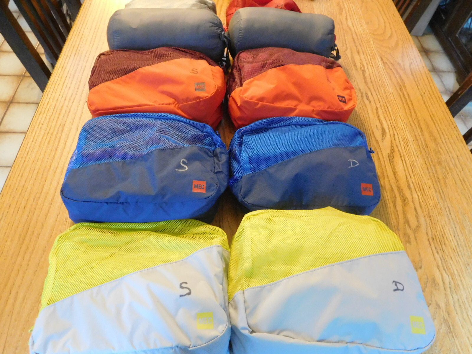 So now we have reached what we think is the ultimate in organization: all clothing in just five bags each. Yellow is like "emergency" - serious rain gear; blue is for chilly times - long sleeved merino stuff; orange is - ok, I forget!