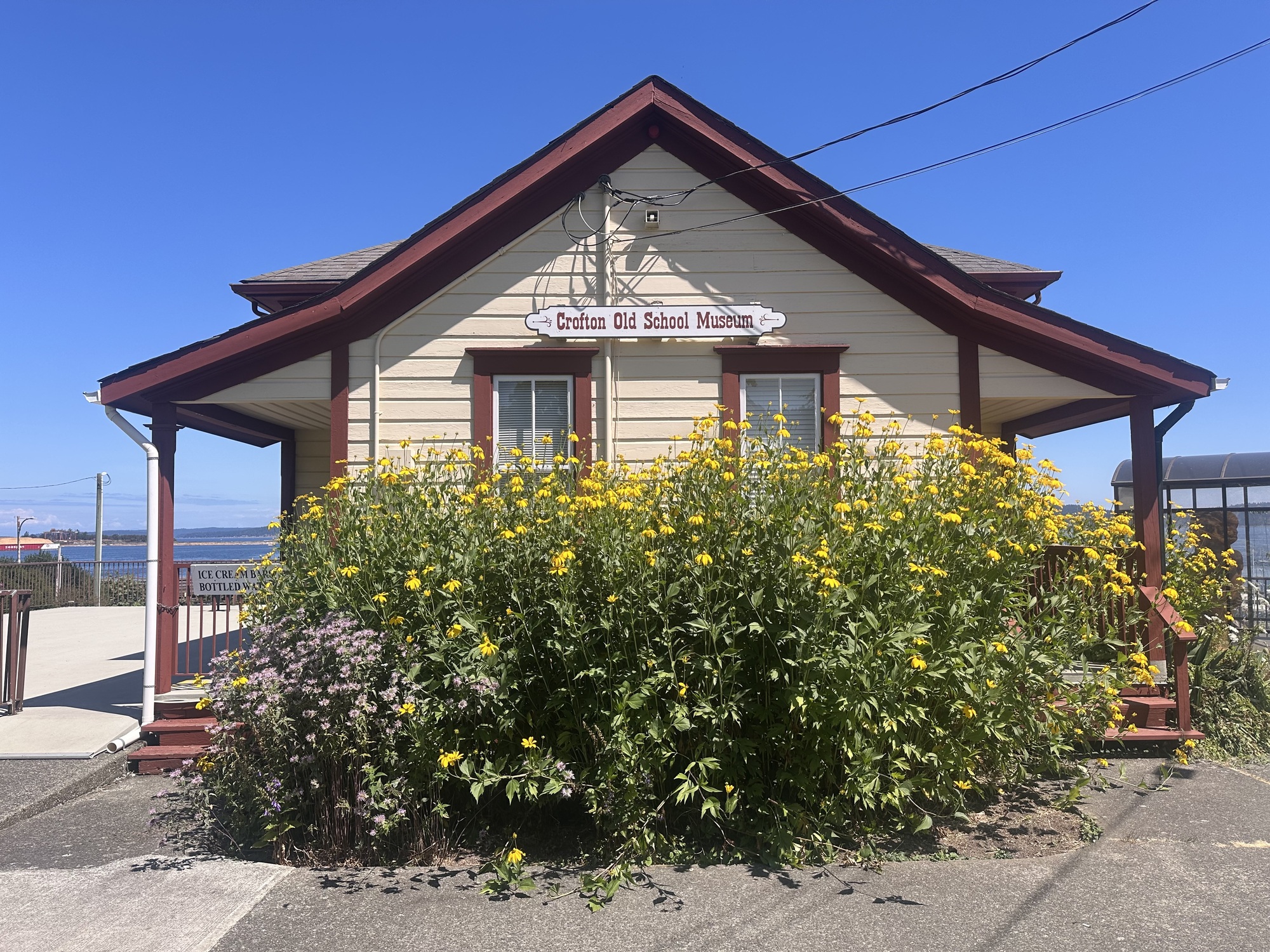 We did get to Vesuvius, which has just about the chillest ferry waiting area we've encountered. Again a short trip with a short boost to the electronics, and we were in Crofton. We were out of water, so stopped at the old schoolhouse museum to fill up bottles and buy ice cream sandwiches.