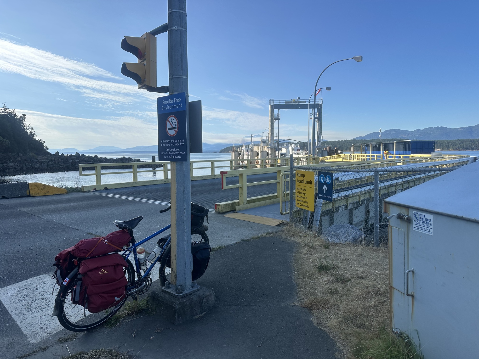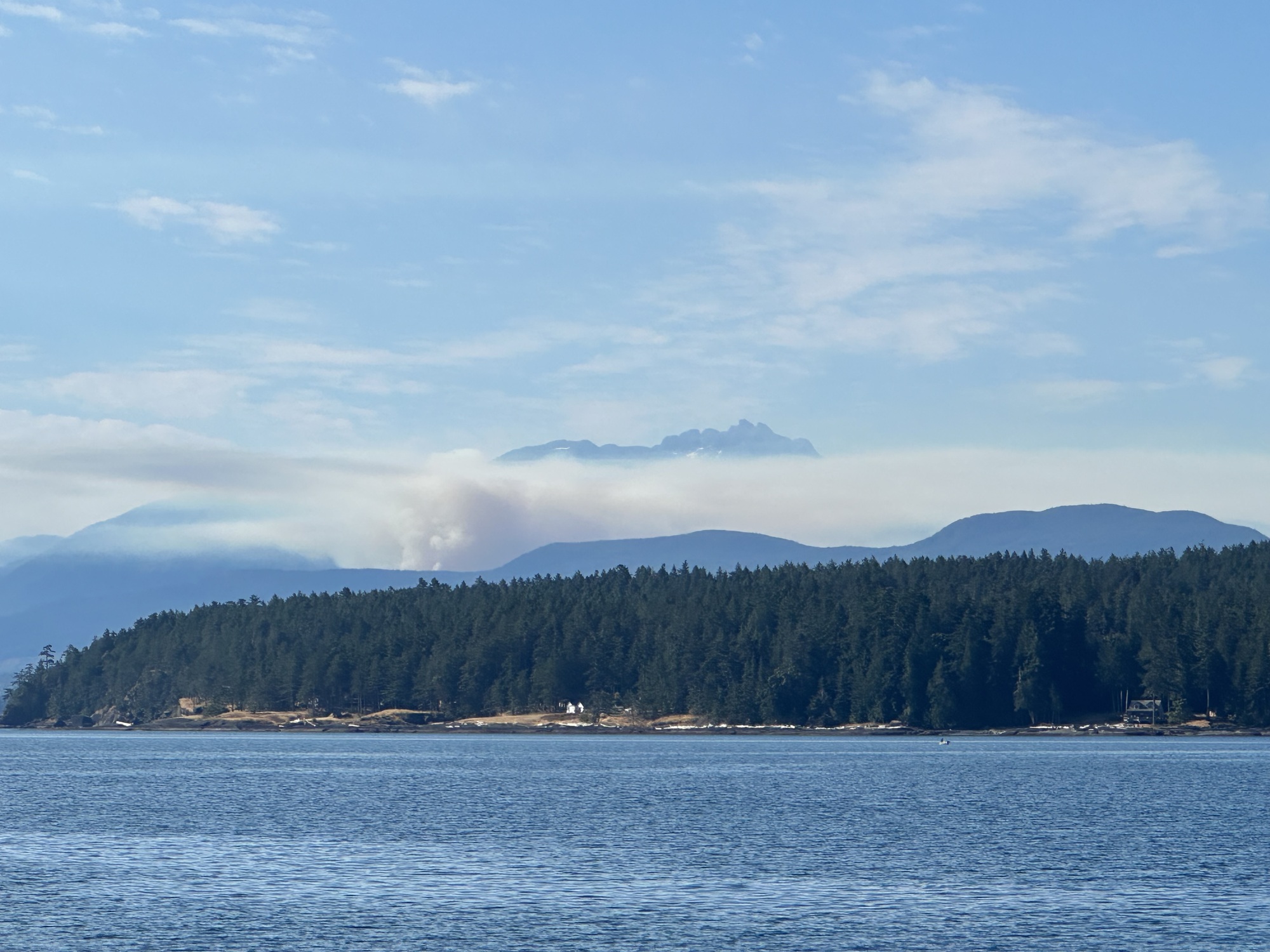 We got lucky with our timing for both ferries — arriving for the Denman ferry as it was unloading, and sneaking in as the last passengers loaded on the Buckley Bay ferry. On the Denman ferry we observed a forest fire, thankfully not in the direction we were going.