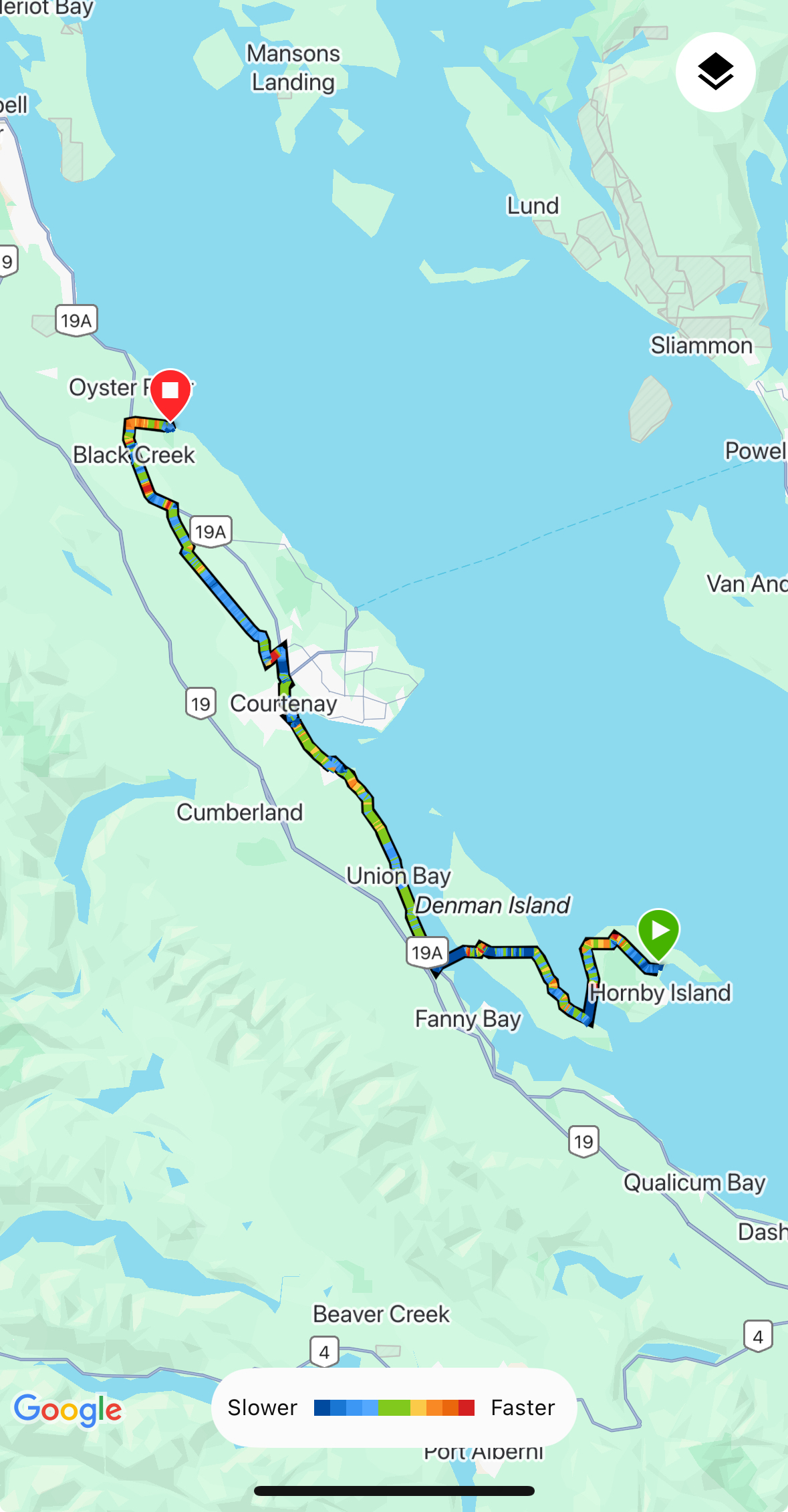 We were back on Vancouver Island by 10:30 with 50 km to go, so the day was well in hand. We were back on the Island Highway, and clicked through the km at a decent pace.