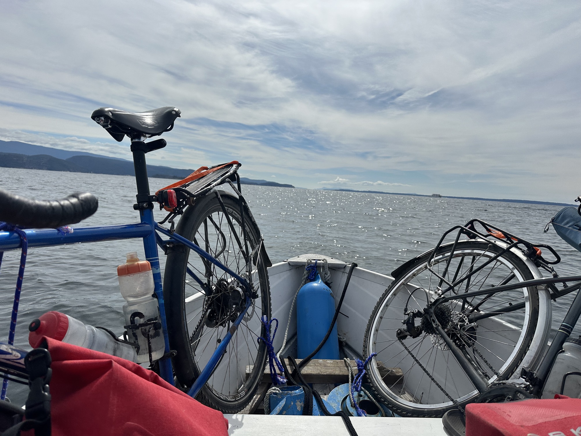 And off we went, chugging past the pleasure boats in the harbour until we got into open water and Brian opened it up and we bounced over the waves, spray in our faces, bikes bouncing against our knees.