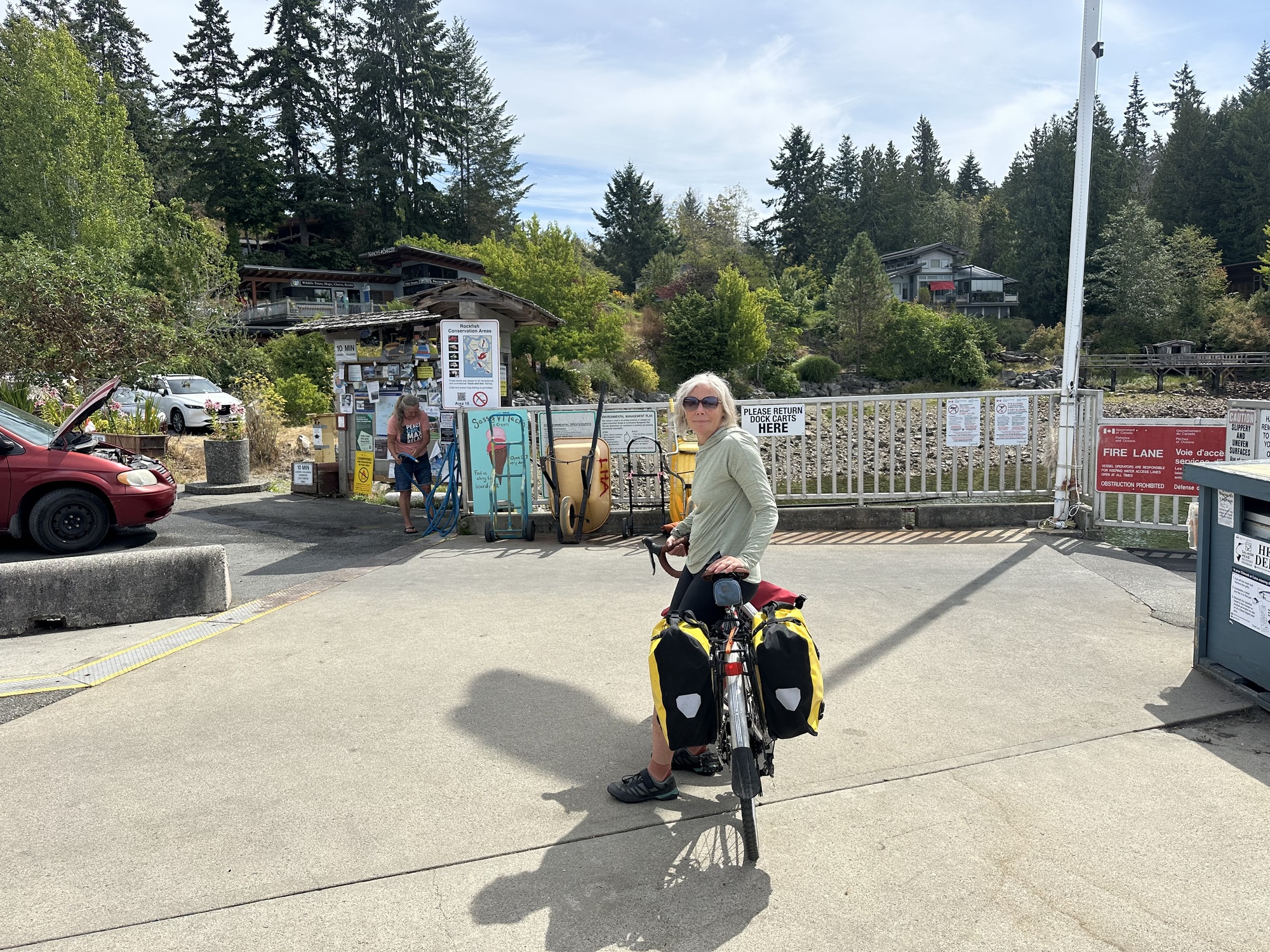 A small motorboat had docked, which I had thought was just a launch from one of the pleasure boats. But, no, the guy running the outboard said he was Brian and was looking for 2 bikers.