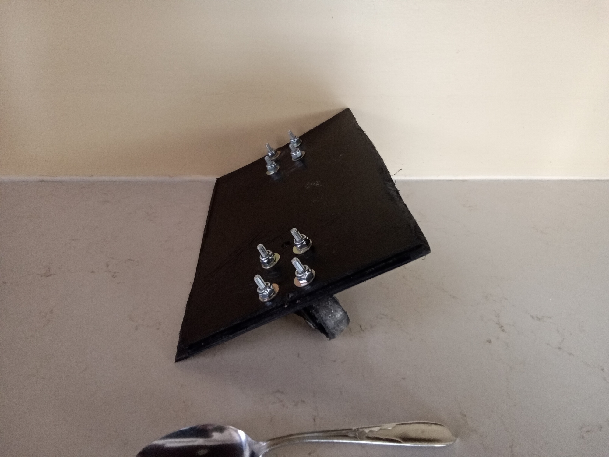 Here is the gadget I used to roll my boxed bike around when navigating the Metro then streets to my Madrid hotel, then from my Lisbon hotel via metro to the airport. I have three nylon straps around the box to hold it closed and loosen the centre one to slip this gadget under the box lengthwise, kind of like a mini skateboard. Then I retighten the strap. With the bolts digging into the bottom of the box and the strap holding it there, it doesn't slip out of place. The first attempt was near one end but the box was tricky to manoeuvre. Centred worked quite well.