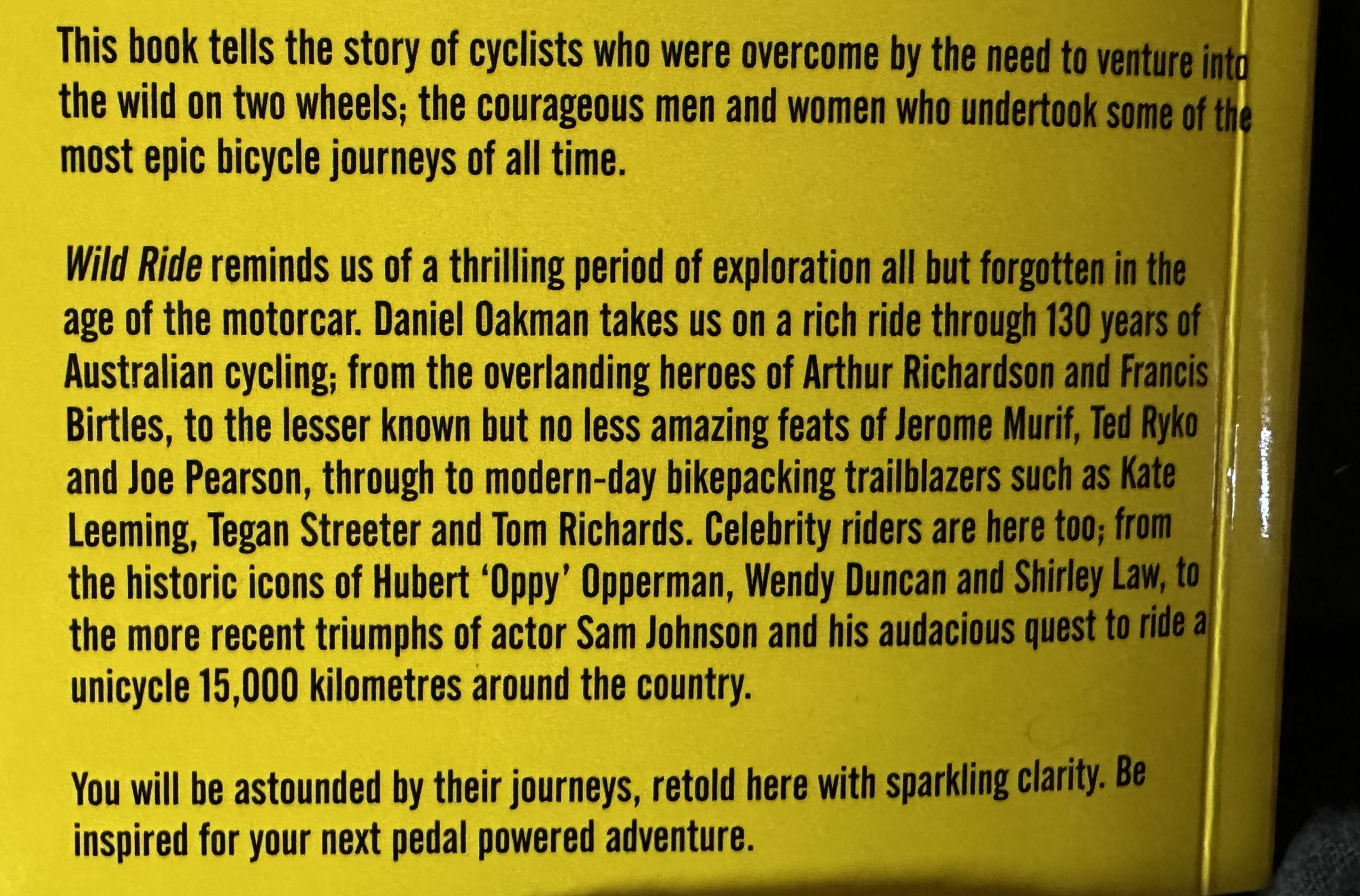 I’ve now finished reading Daniel Oakman’s book and thoroughly enjoyed it. It complements another fairly recent book called “Overlander” by Rupert Guiness. Reading this inspired me to do a 3800km cycle tour from Canberra to Perth.
