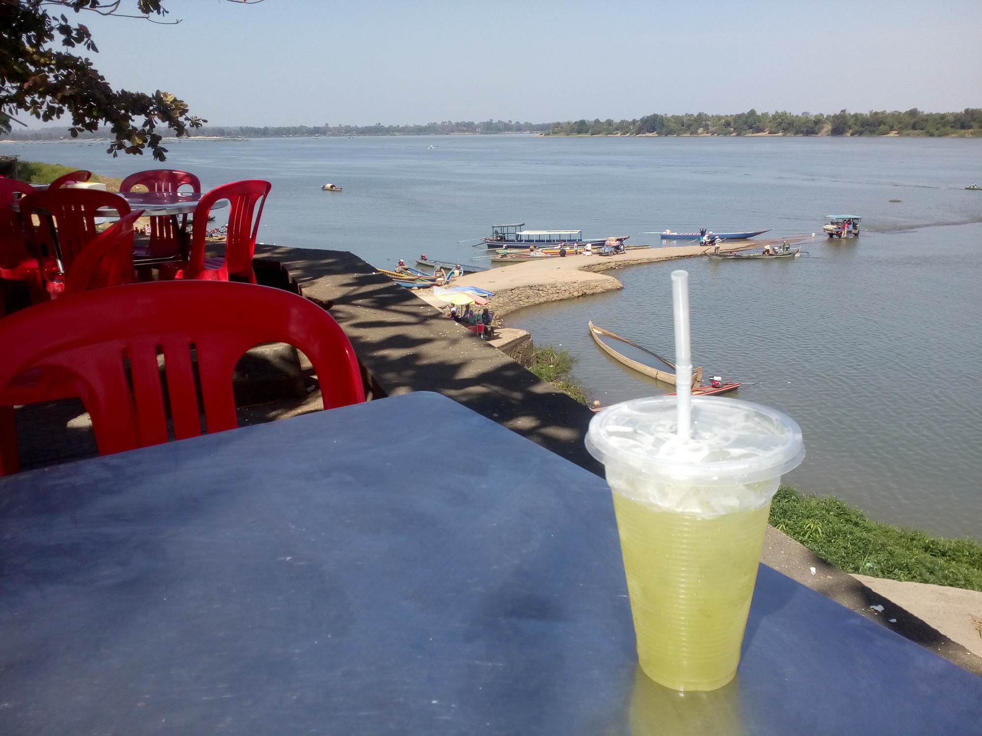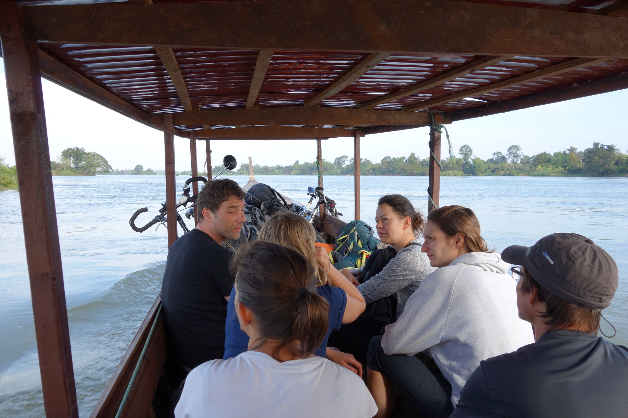I thoroughly enjoyed last night´s little farewell party with French-Canadian Bruno who liked the guesthouse as much as I did and therefore extended his time to more than a week. I somehow understand him but I myself do get itchy after just one day of rest. I guess I am more a mover than a relaxer. Enough philosophy, boarding the boat brought me quickly back to reality. Instead of telling me to just roll over the bridge and board at the terminal in Ban Khone the ferryman picked me up at the steep, sandy bank near the guesthouse. What an effort! I was very close to go for a swim while using another narrow boat to get my gear onto the ferry. Absolutely ridiculous. At least there were only 2 people onboard so far so there was at least space enough to handle and store the bicycle properly. We had about four more stops until the narrow boat was at its full capacity of 12. I was lucky to have Leo from Holland next to me, another cyclist but unfortunately going the other way.Would have been nice to have some moral support during that difficult stage as I would only find out later.