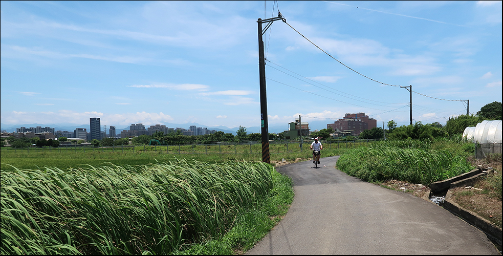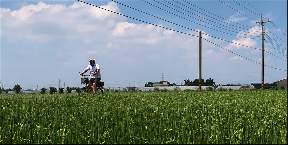The rice that's growing is a few feet tall and the grains are getting heavy. Sunflowers in one field have drooped. Substantial grass grows along parts of the verge and sways in the breeze. There are numerous polytunnels and most of the fertile land appears to be smallholdings, but there are no people around. Maybe everyone is having lunch.