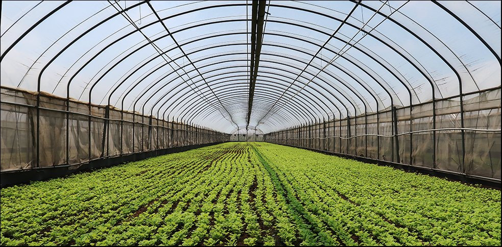 Just along the lane I see some without the wiring and stop and lift the bottom edge of the mesh, with the small green shoots planted in long lines enhancing the length of these structures. I think they're called hoop houses in the US.