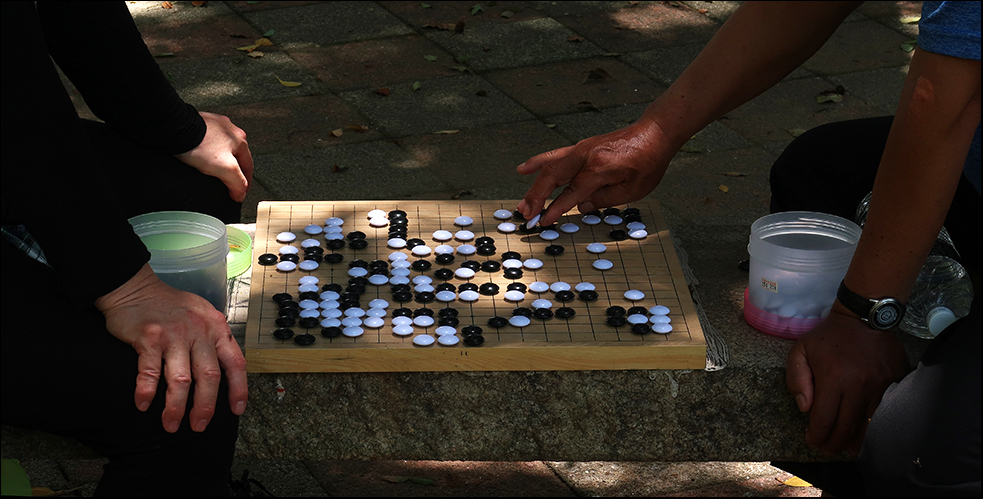 At another bench are two men sat opposite each other, their legs straddling the concrete, playing a board game. It doesn't look like mahjong, which is popular here. When I walk past I can see they are playing go - an old Chinese game that goes back millennia. I don't understand it.