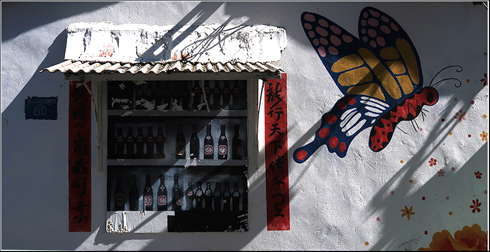 Across the 112 and down a lane is an older house that has a mural of a shop window painted on a wall and the sun is lighting it up, but maybe in an hour there'll be more direct sunshine. My mind is unsure if the photo is one of a wall or a window. Nevertheless, I take a snap, then ride into town along the busy but narrow urban artery that's the 112.