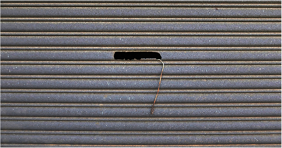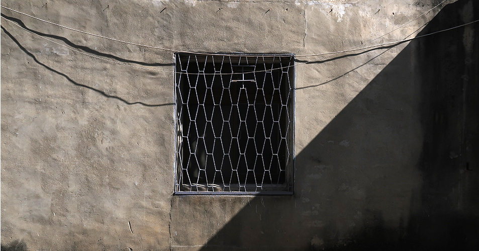 The first window has a metal grill and you can't really see the window frame or glass due to the metalwork - thin steel strips are welded into elongated hexagons and its all been painted mauve, enhancing its 1960's style. The position of sun is about right at this time of day, with a stark shadow forming across the unevenly rendered wall of the house.