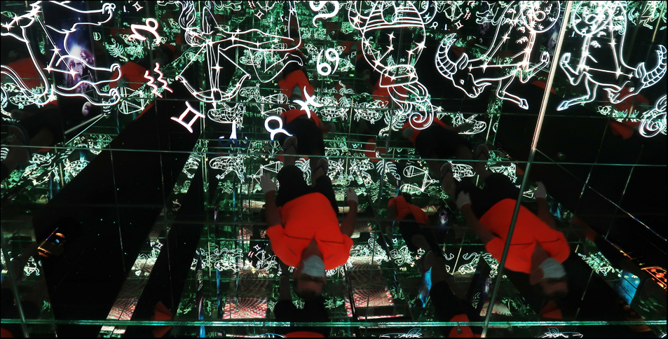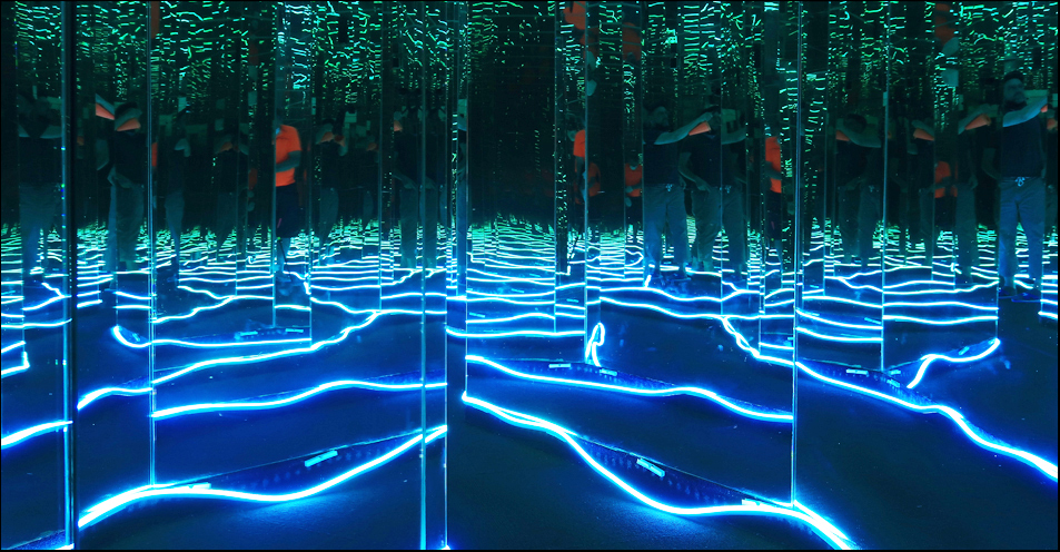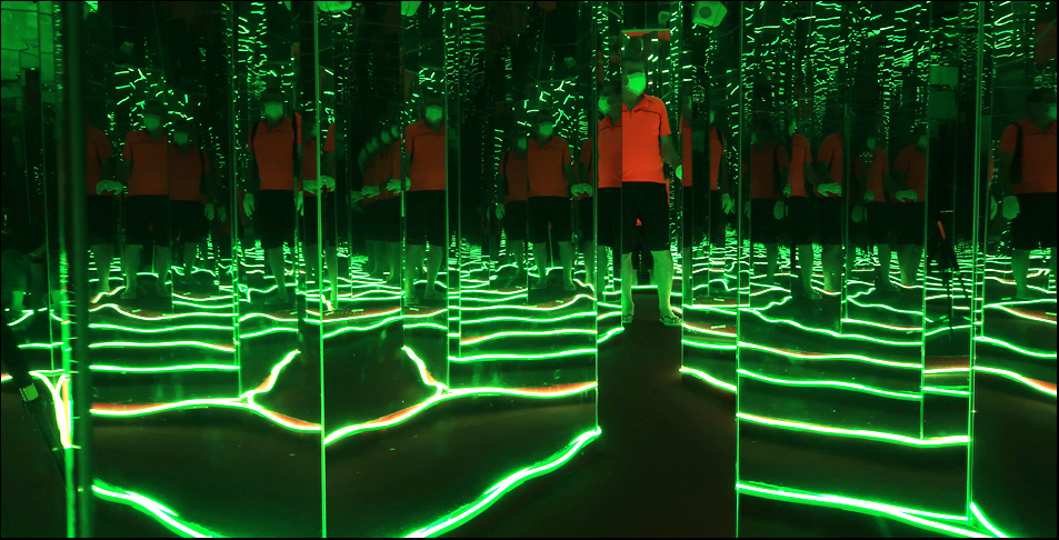 The maze is disorientating, with angled mirrors reflecting image after image and the darkness and LED strip lighting add to the general confusion. Some areas have mirrored floors and ceilings, and for some whacky reason there are steps here and there that make it easy to trip and fall, but it seems that g and I basically have the place all to ourselves, which is nice. We reckon it's NT$200 well spent.