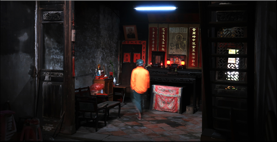 We wander through a busy market area with fruit and veg getting snapped up, then discover an old house nearby that's open to the public. It's free, so we step inside the ramshackle doorway to find a shrine to ancestors lit with the usual red lights, while the rest of the room remains pretty dark. We have to squint. Ladder-like stairs lead almost vertically up to a balcony circling above, but all the woodwork seems dodgy and we opt to keep our feet on tiled terra firma.