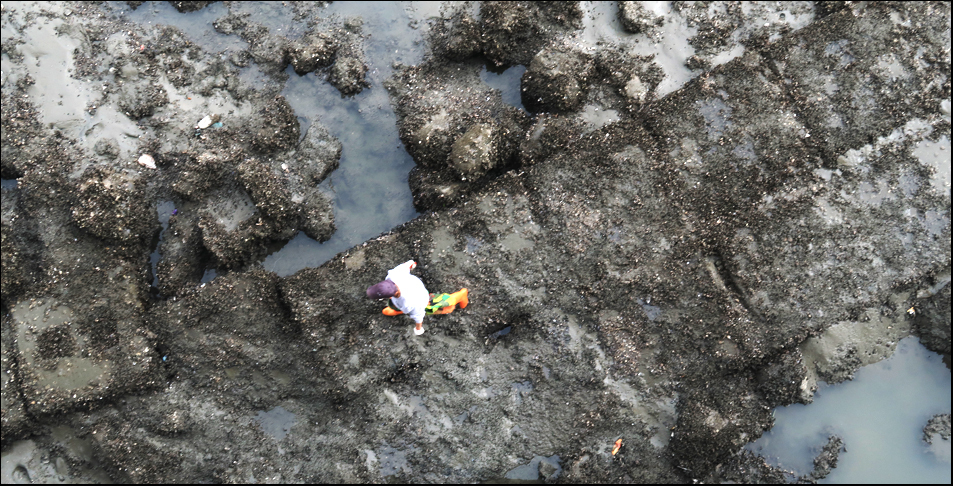 The bridge sweeps in a gentle arc over a shallow river and directly below are a few fisherman using sticks to poke around small pools of water trapped among rocks. We can't work out what they're looking for.