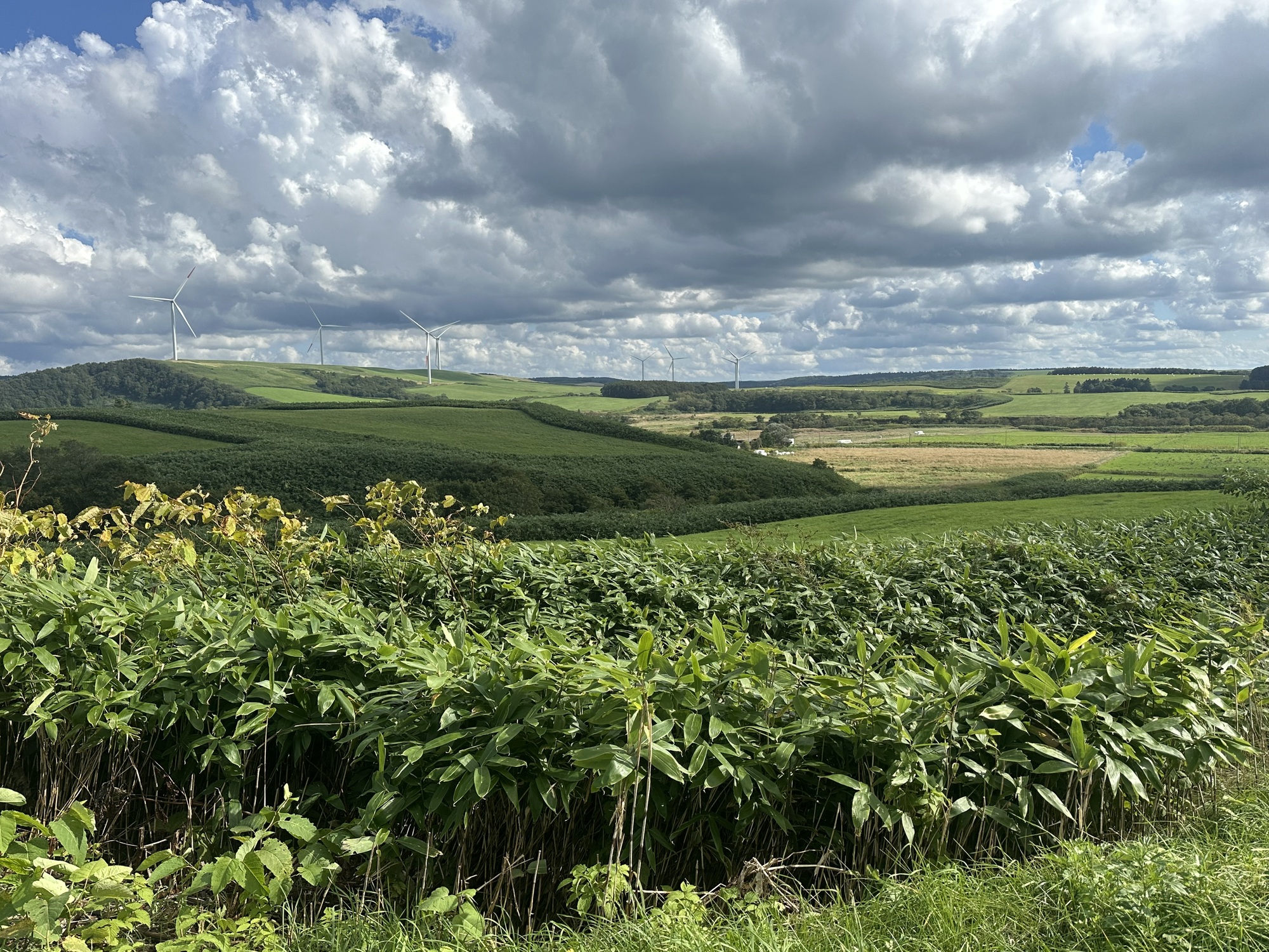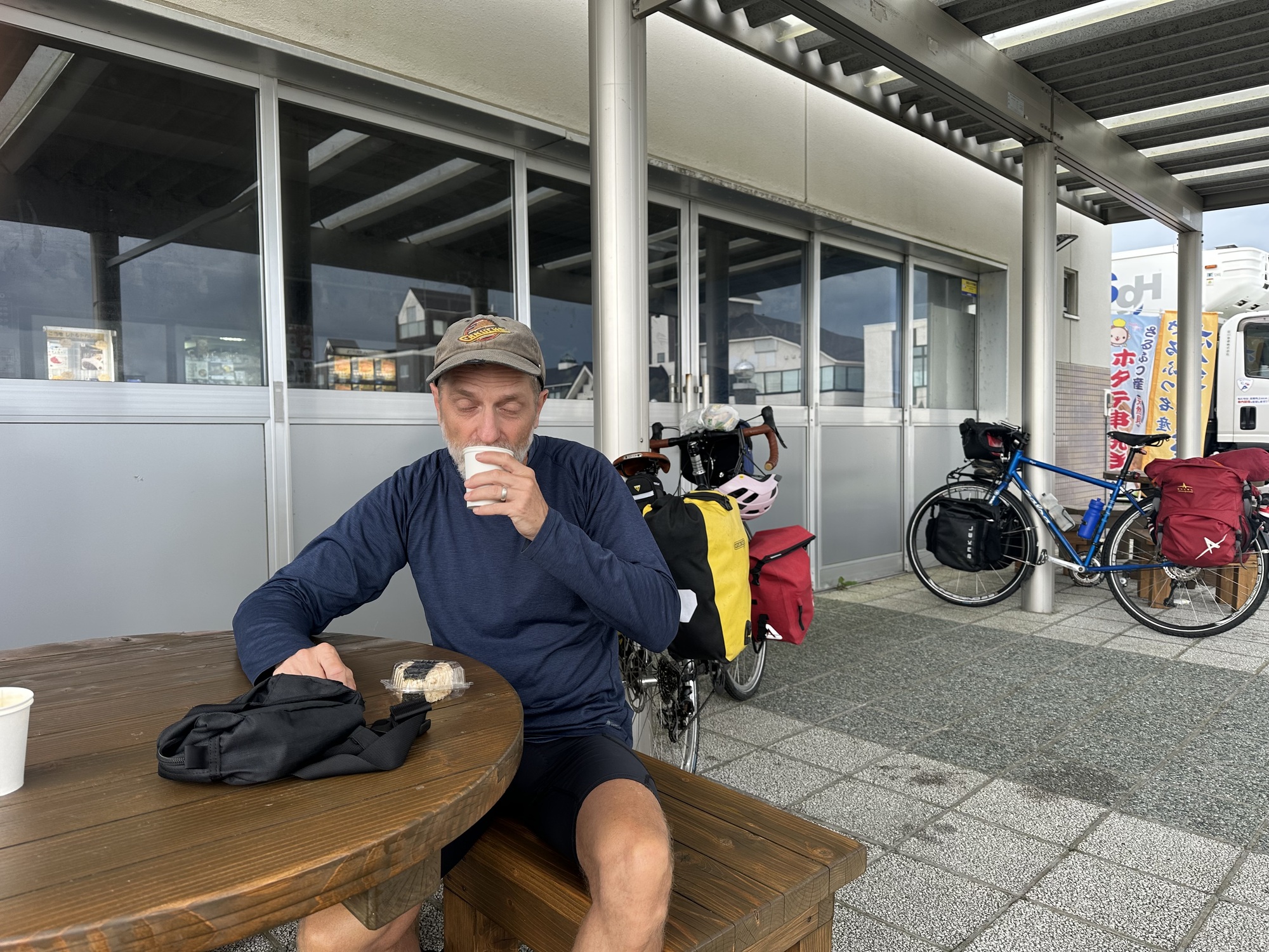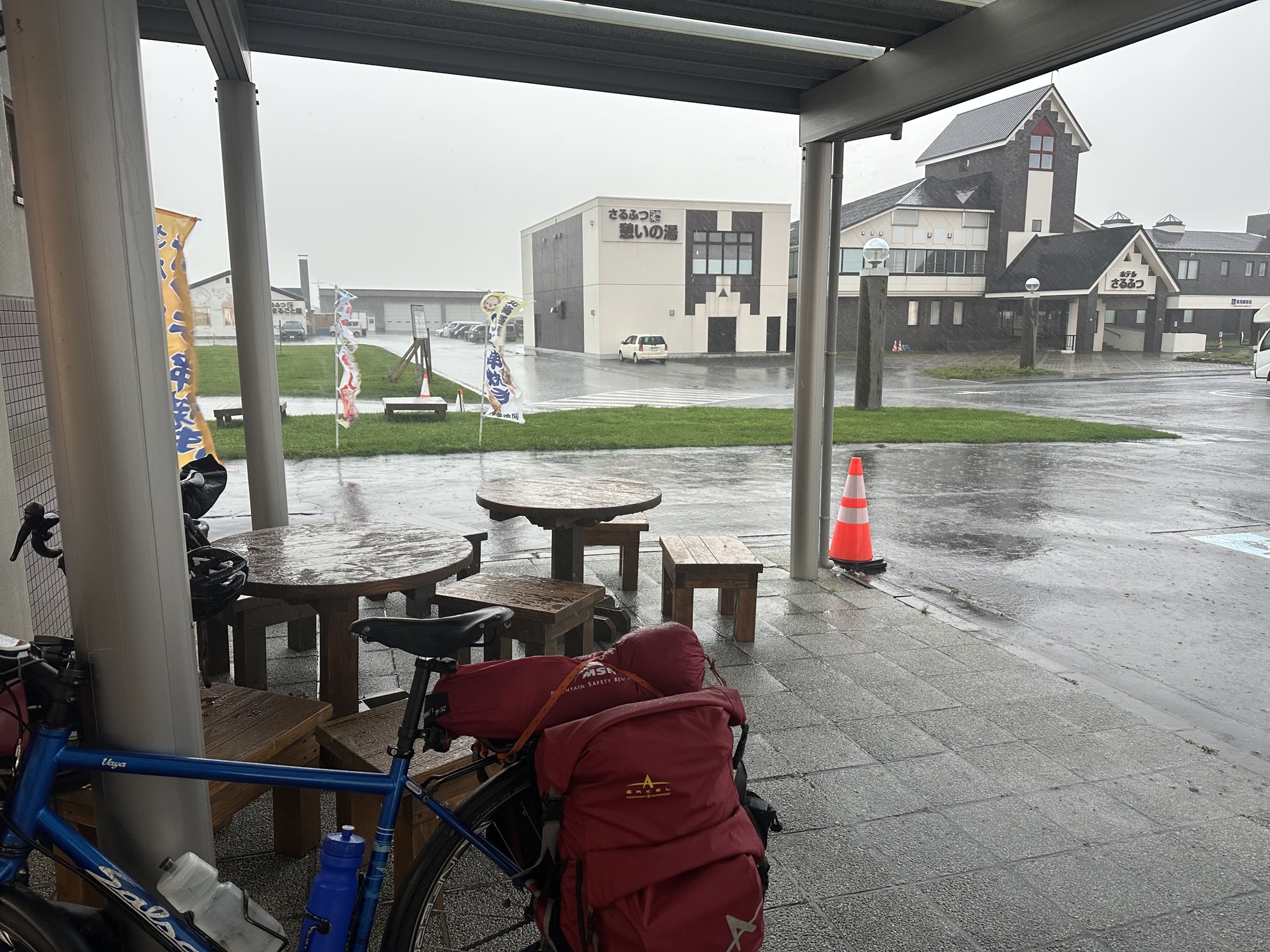 We packed up and wheeled the bikes over to the Michi-no-Eki by the highway (these are a bit like a tourist info centre in Canada, but with shops and restaurants as well) to get a coffee and watch the sky. A very black and threatening bank of clouds was building in the west.
