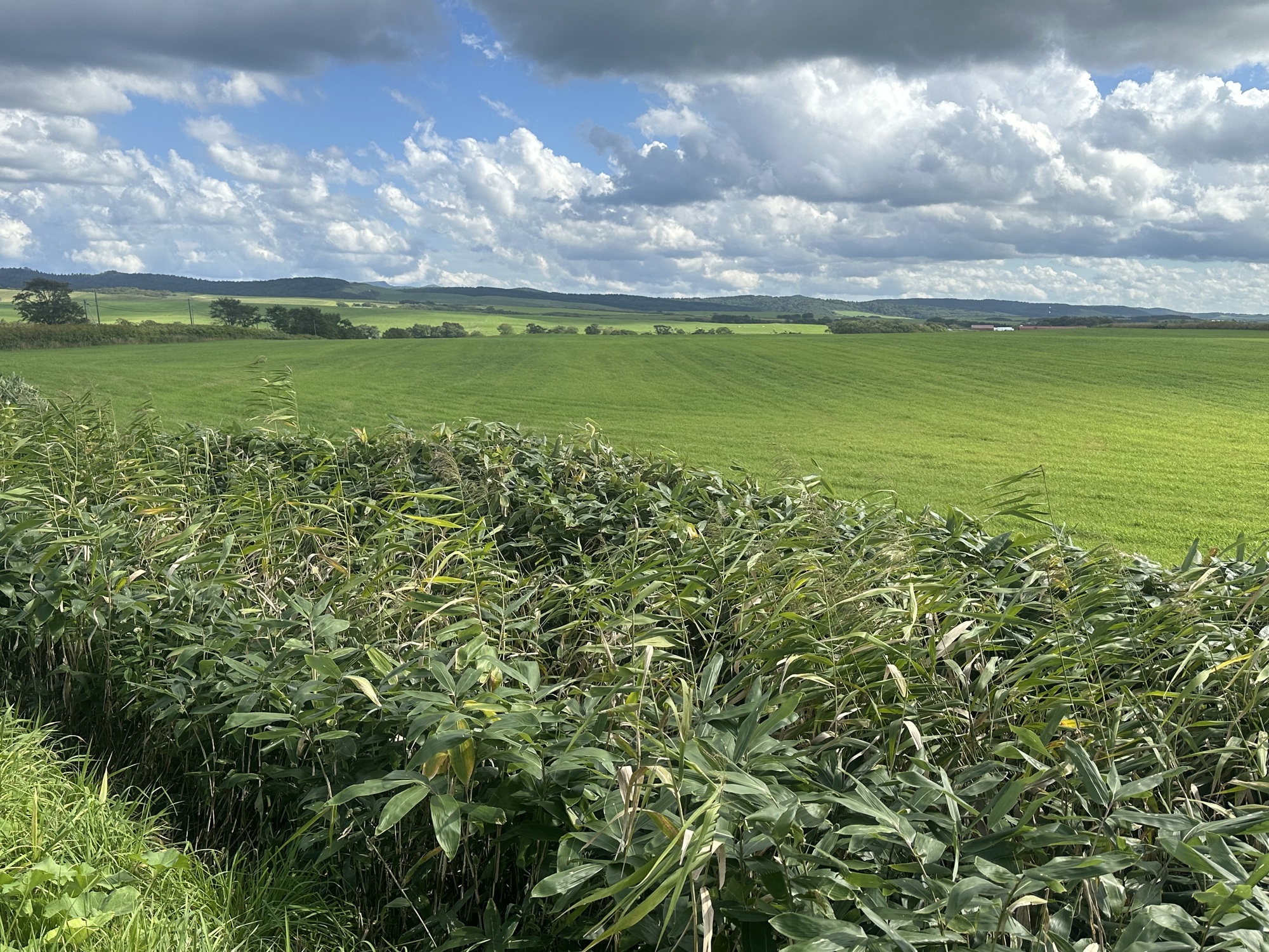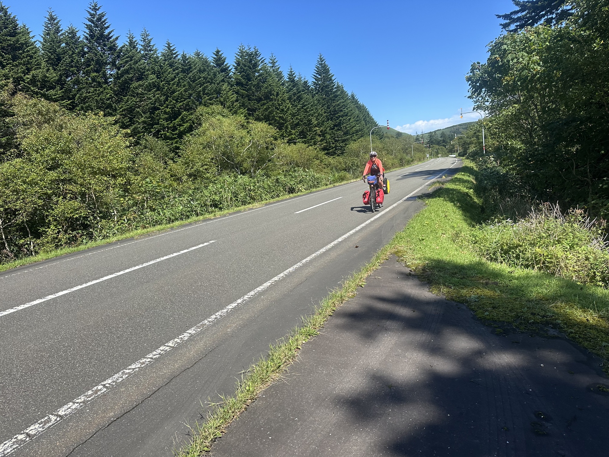 Since we passed Cape Soya the previous day we’d been riding south down the east side of Hokkaido, but now it was time to cut back across the island to the west coast. We were on a little country road, following a twisty river through a narrow valley — a very lovely sunshiney ride through the woods, and we had it almost to ourselves, with only about one car every ten minutes passing us.