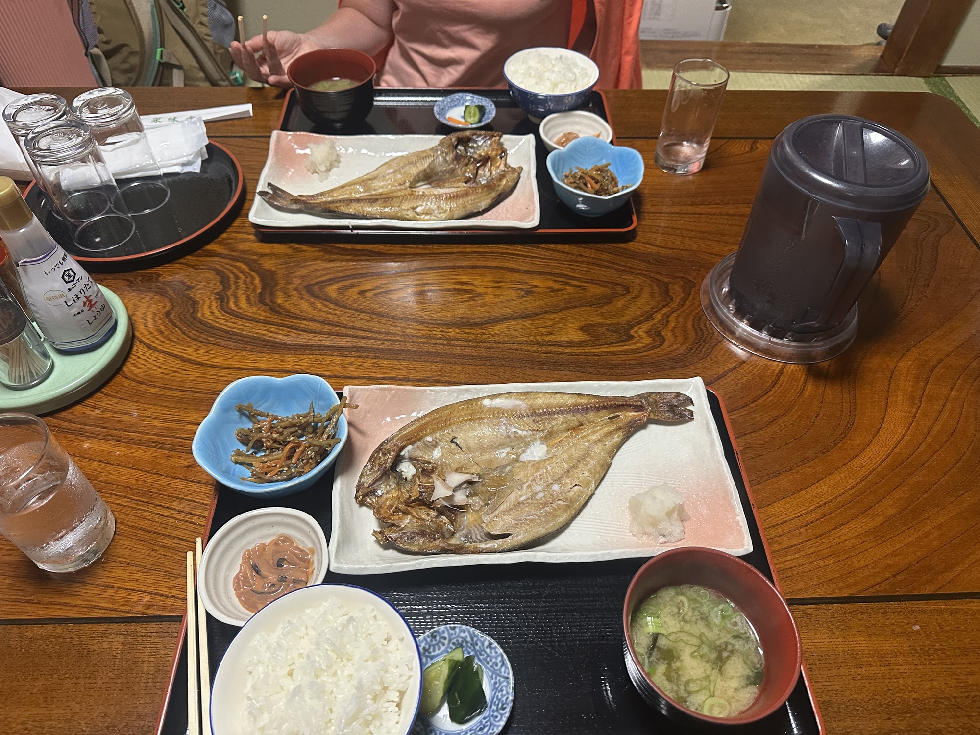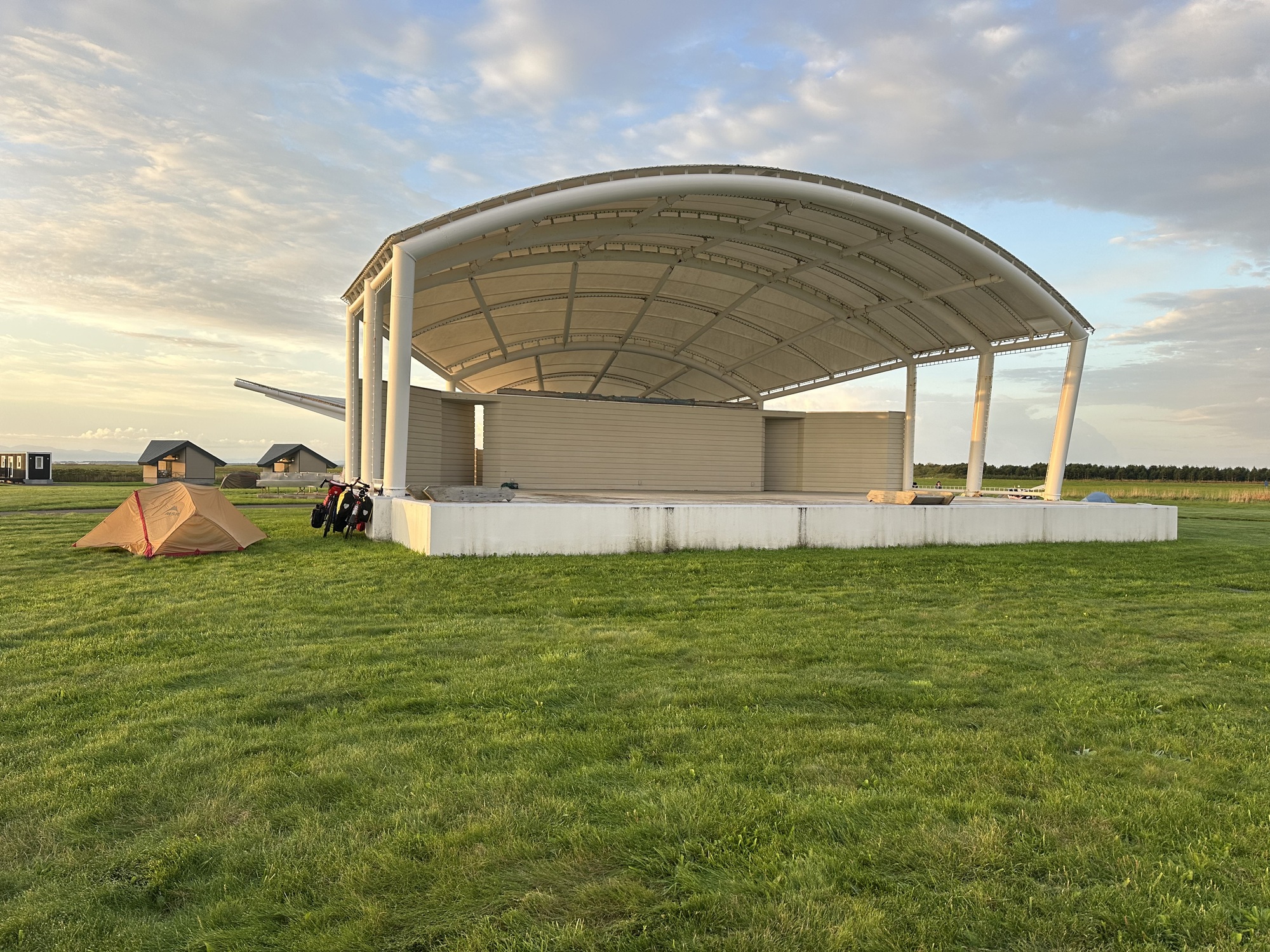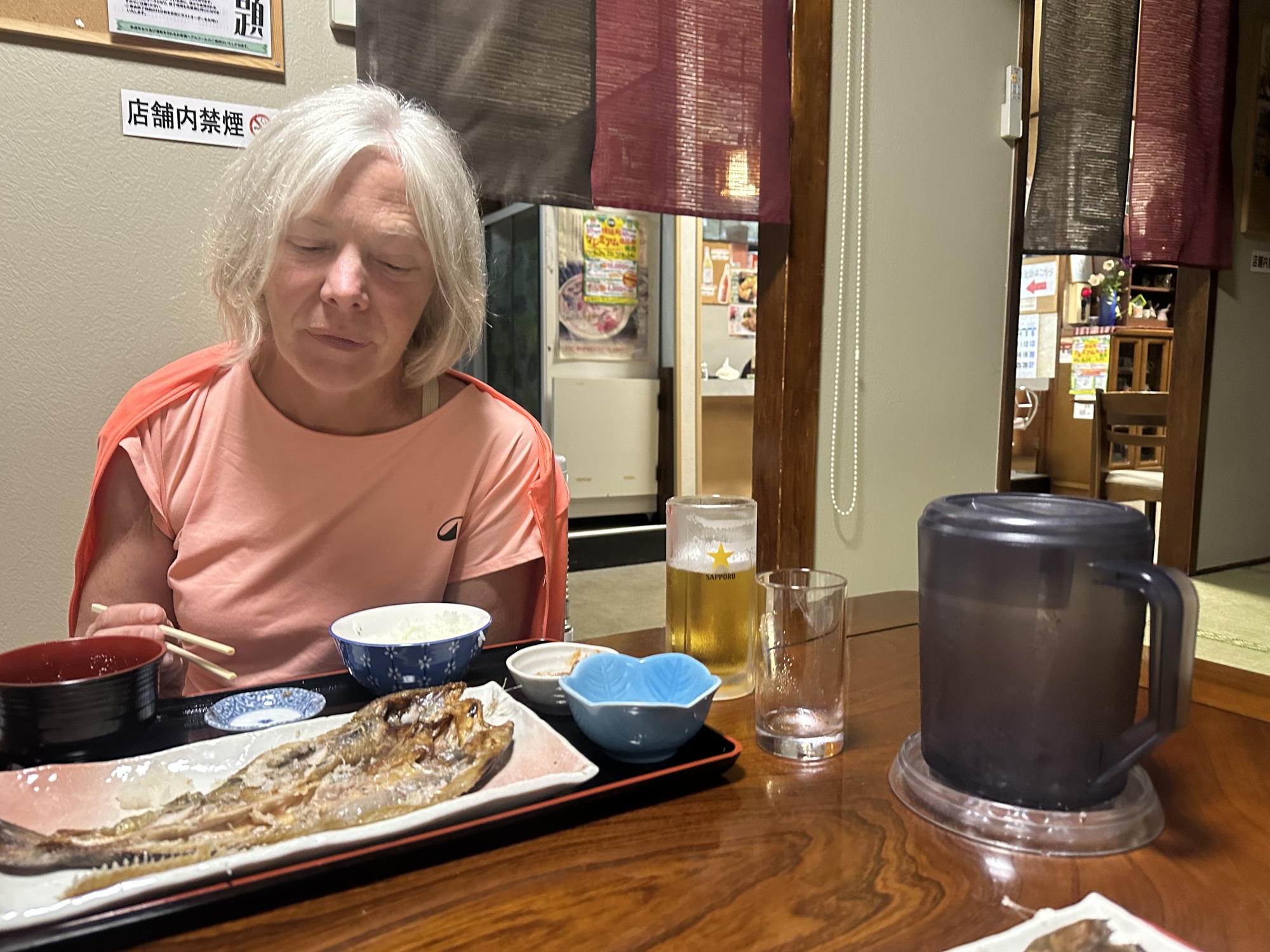 We arrived at our destination, the town of Horonobe, around 4pm and set up our tent in the community campground — we were the only campers. Then off to the local seniors center for an onsen, after which we found a grocery store to stock up some supplies, and had dinner in a tiny izakaya.