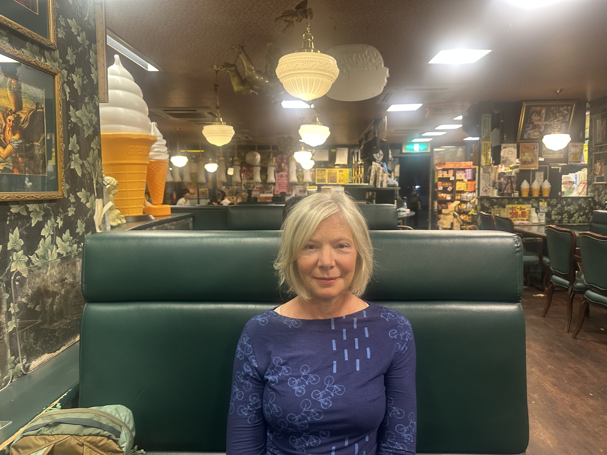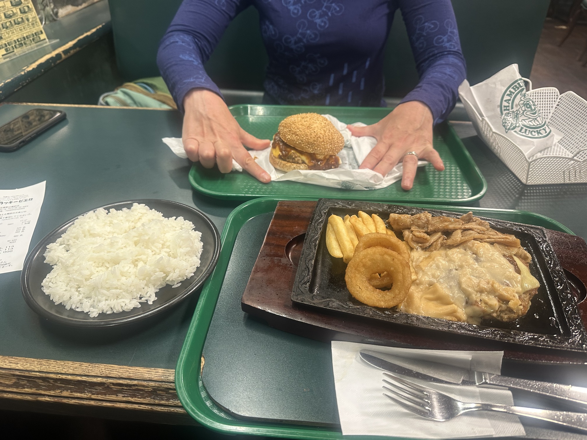 Continuing the east meets west, cultural mashup theme, we ended the day at a Hakodate institution: a Lucky Pierrot hamburger restaurant. It’s a local chain, apparently with 17 locations, all in this one mid-sized city. It’s a clown-themed, retro-diner ambiance, with (at the location we visited anyway) many framed pictures of cherubs and many enormous plastic ice-cream cones. And a menu that ranges from hamburgers to spaghetti, to filled omelets, to hamburger steaks with rice.