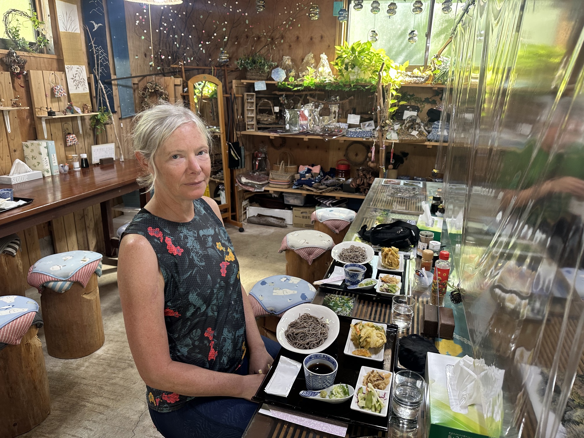 The flat agricultural / townsite eventually turned uphill. And it turned out the road was pretty good! No bad traffic, mostly ones and twos of passenger vehicles, and the climb was fairly modest. After a brief bit of climbing we came to a roadside lunch stop run by a couple of older women, patronized by what seem like regular passersby. We had cold soba noodles for the first time on this trip, which were both refreshing and filling, and set us up well for the rest of the afternoon’s climb and descent.