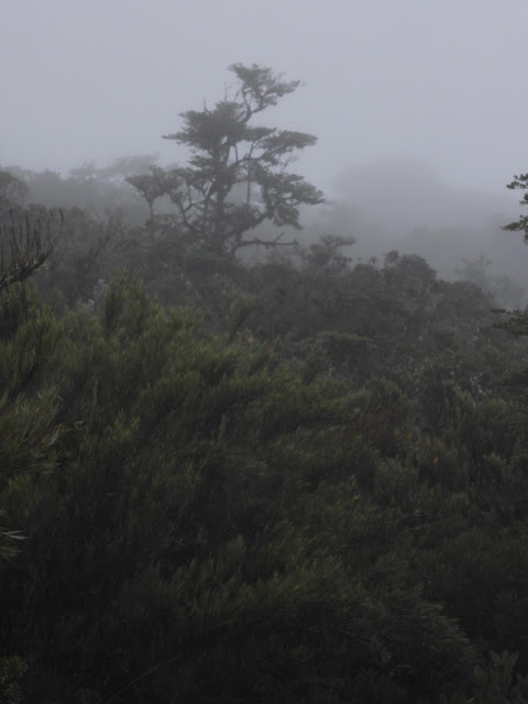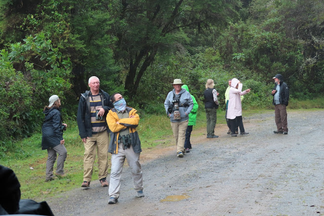 Surprisingly, the impression here could be of some level of luxury, for lazy tourist types. But no, or at least not entirely. In rain or sun, in low altitude bugs or high altitude cold, Alex (and therefore we) started at 5:30 A.M., which was the time of dawn. And it didn't end until the review meeting, in the dead of night. The day usually included hiking through rain forest, or along up and down roads. The best spots, for us, were hotel or restaurant observation decks that featured bird feeders. But even among these, it was generally go, go, go.