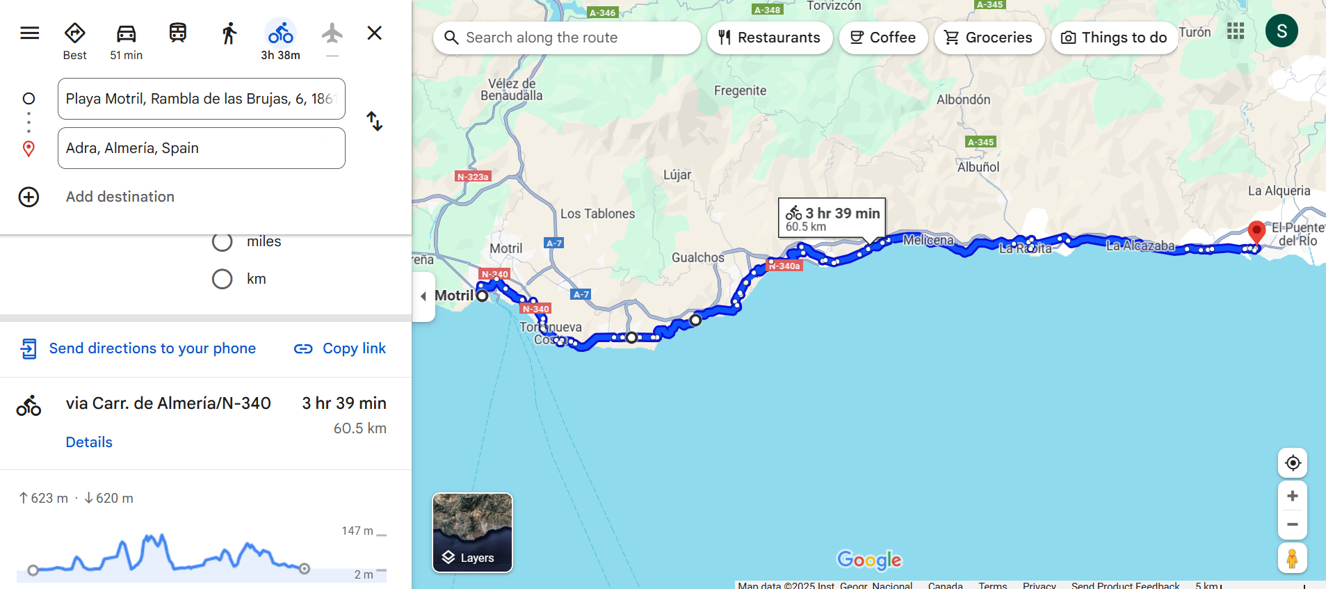The last time we rode in Spain, which was just one year ago, we just grabbed the EV 8 track and set off merrily along the Mediterranean coast. EV 8 often led us astray - into deep sand or up impossibly steep headlands, but somehow we just pedaled through (or around) it. Time has mellowed the memory of most of those sand traps or mountains, but not so much that we would want to just barge into them again. Part of this is that we were young then, in 2024. Now in 2025, enough bits of our minds and bodies have fallen off, or at least weakened, that the game feels different.
