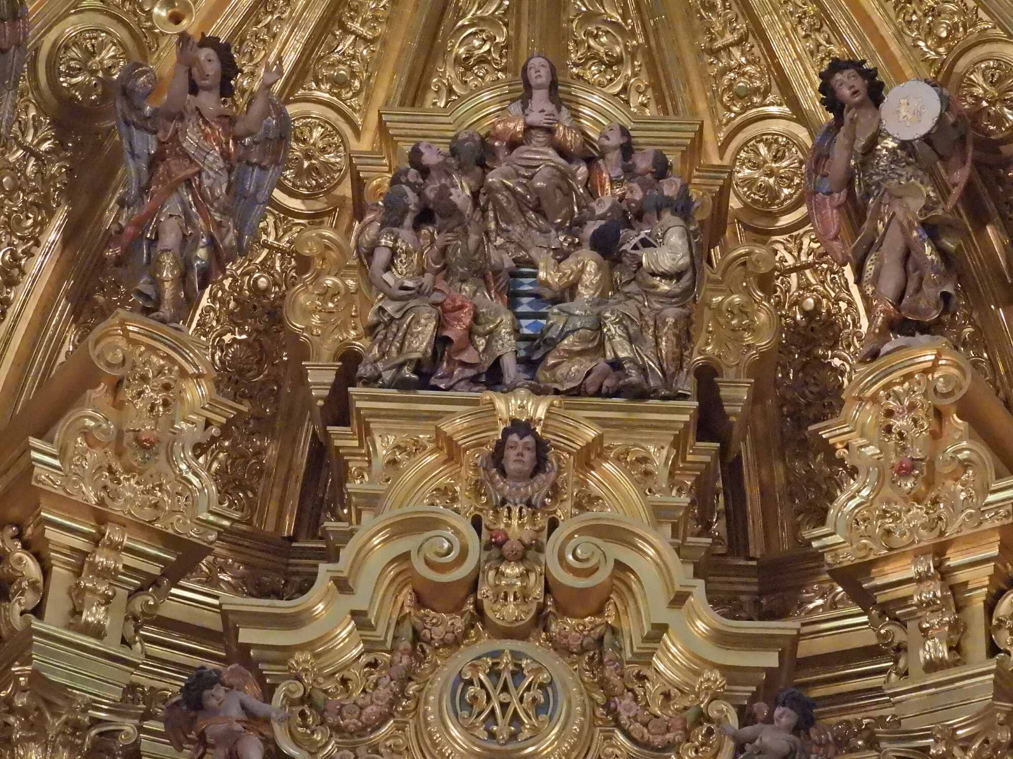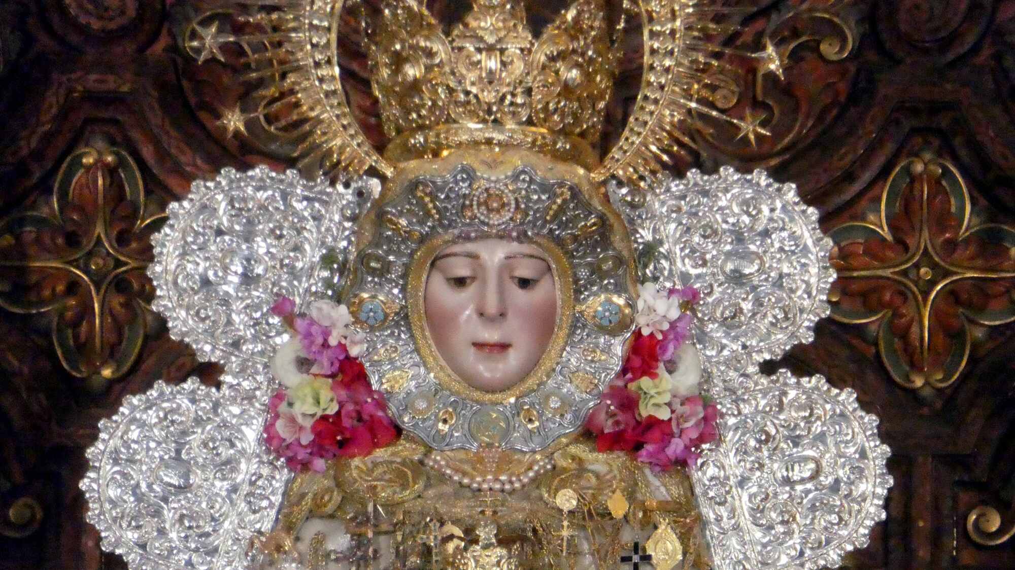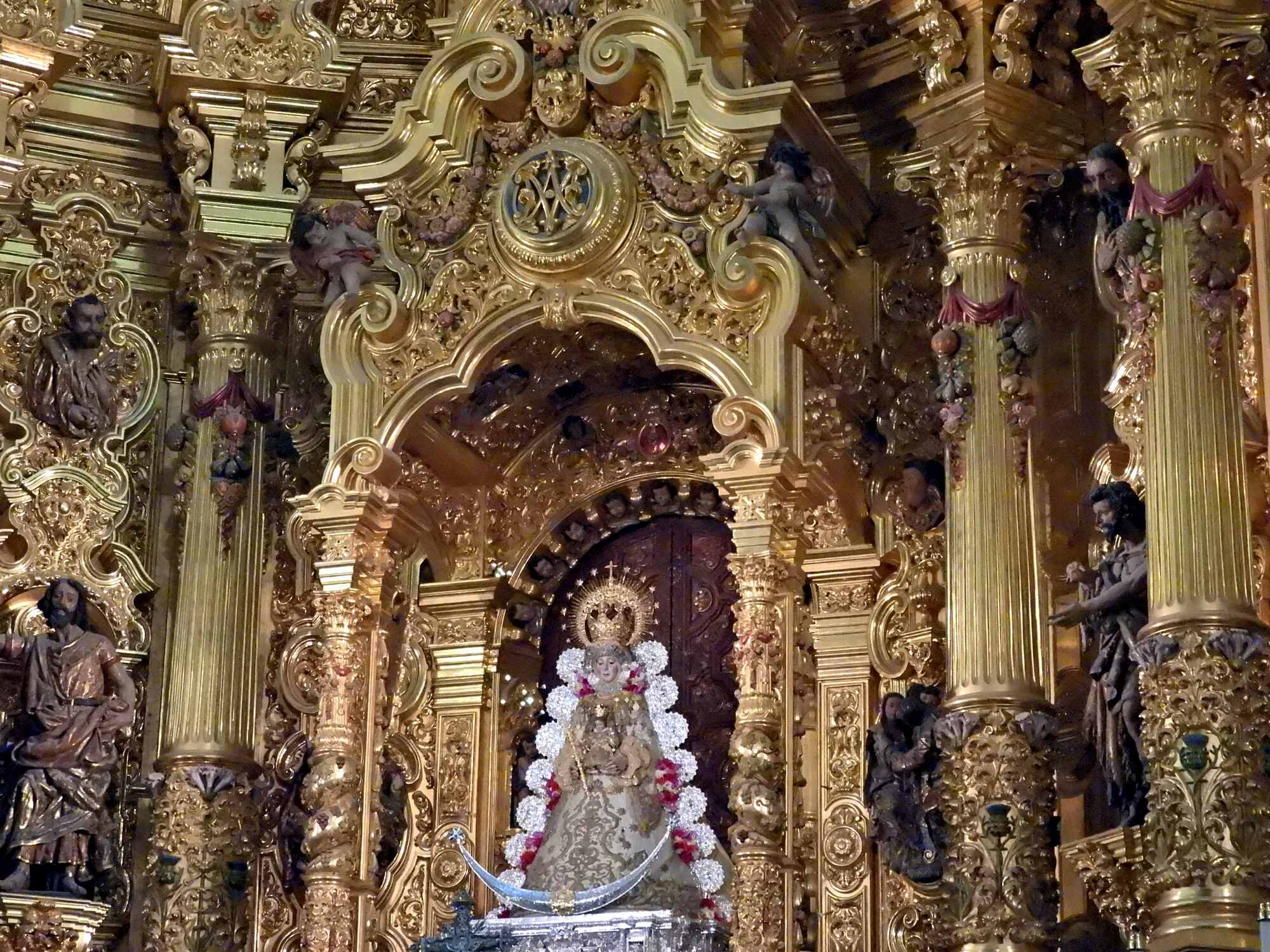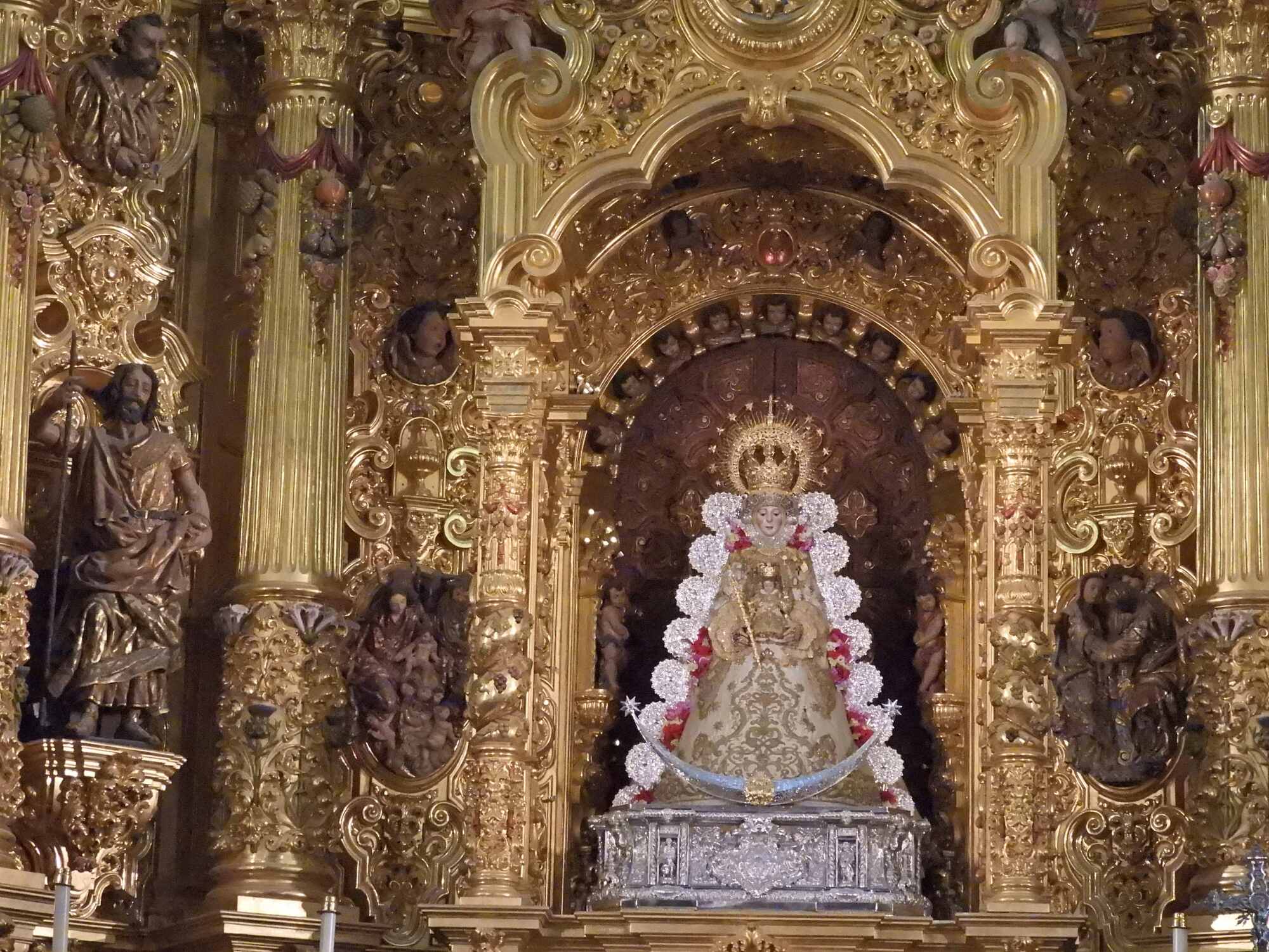 The impressive baroque-style altarpiece houses the most revered image of all Andalusia: the White Dove, Our Lady of Rocío, the town patron. It was sculpted at the end of the 13th century, originally in Gothic style. It was destroyed during the Lisbon earthquake in 1755 and rebuilt again in 1969. She is dressed in rich fabrics, following the Austrian court fashion." (from silvias-trips.com).