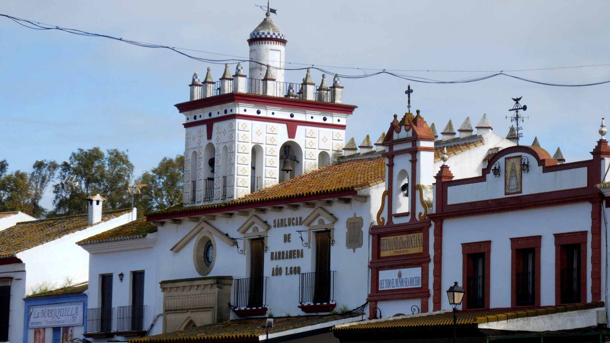 "The shiny white Hermitage of El Rocío, a monumental cathedral conceived as an Andalusian farmhouse topped by a locksmith cross. Built between 1963 and 1969 on the main square, it attracts more than one million visitors yearly.