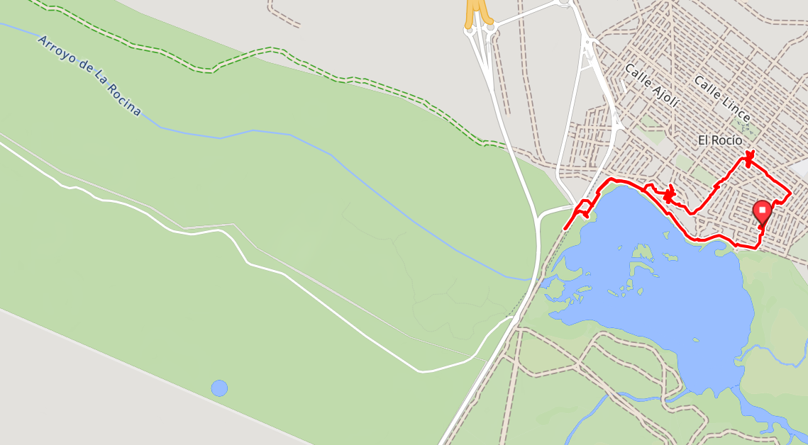 This was getting to be a lot of fun, and we knew there were trails all around the lake, so we walked on. Even if we had circumnavigated the whole lake, it would have been just a small taste of the whole Donana Park. The red pin below shows where we were, at the little lake by El Rocio. The lake is connected to a river that flows through wetlands, and ends up at the Guadalquivir river, over on the right, that is coming down from beside Sevilla.
