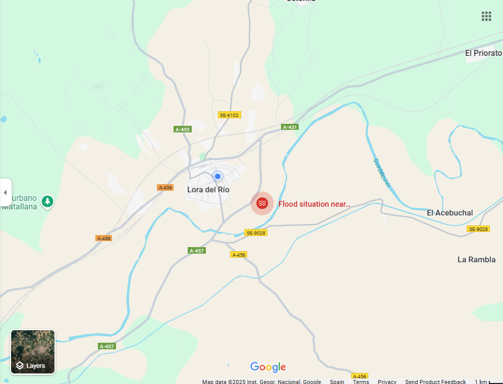 Google says: "By Friday night, Guadalquivir is expected to rise compared to tonight. Use caution if going near the riverfront." And where does our track go? You guessed it. We may have to re-route, and certainly to stay off of any low lying or gravel tracks!