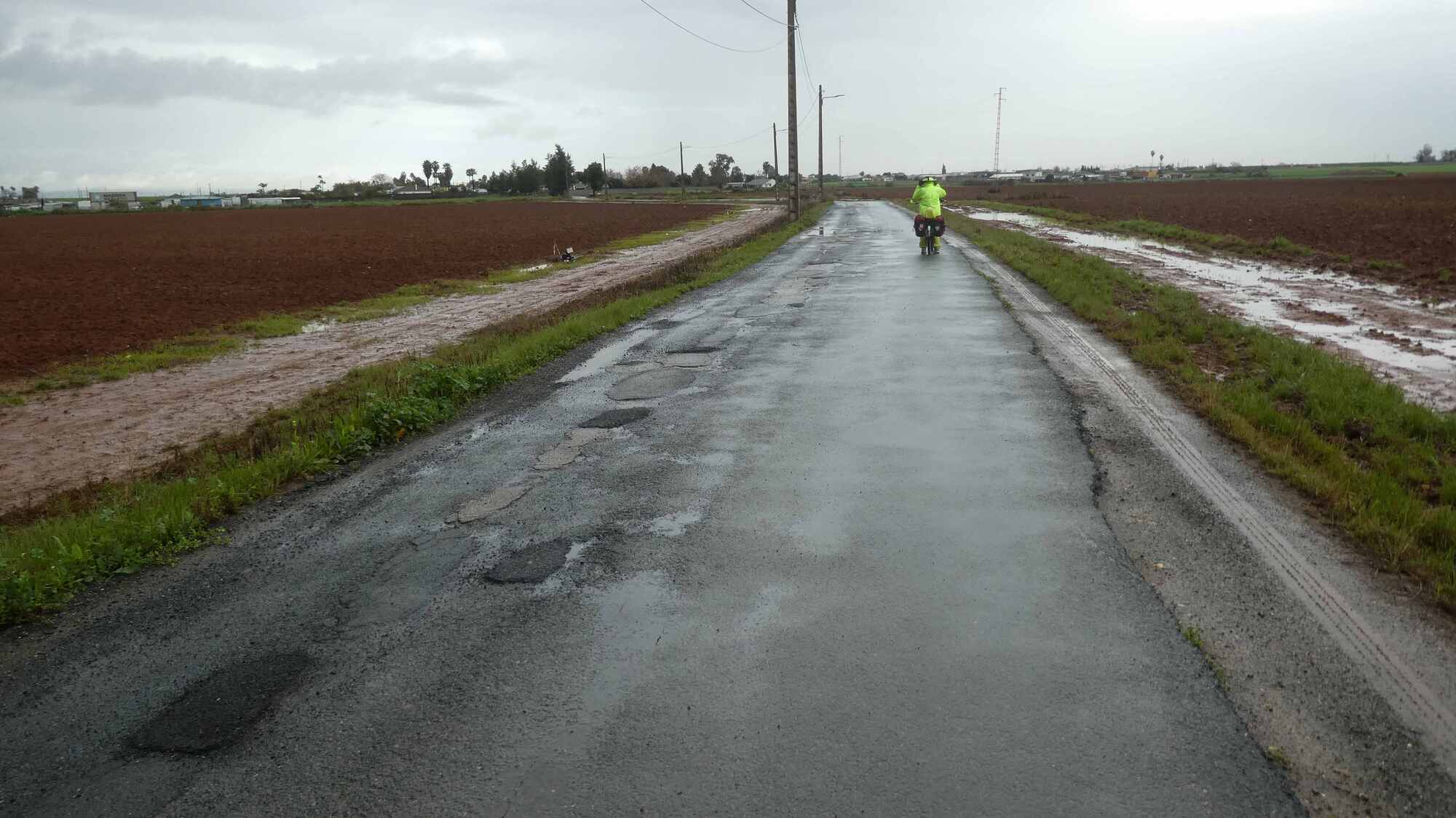Our joy was short lived (again) because now it began to rain in earnest. That accounts for the complete lack of photos to illustrate the next several hours of cycling. And those several hours were, honestly, hell. The road turned into a very busy rural thoroughfare, with lots of dumptrucks, semi-trailers, light trucks, and cars. The shoulder was almost non-existent, and the road - particularly just to the left of the white line - was broken, patched, and re-patched. And of course, to the right of the non-shoulder was a ditch that one would not want to fall into.